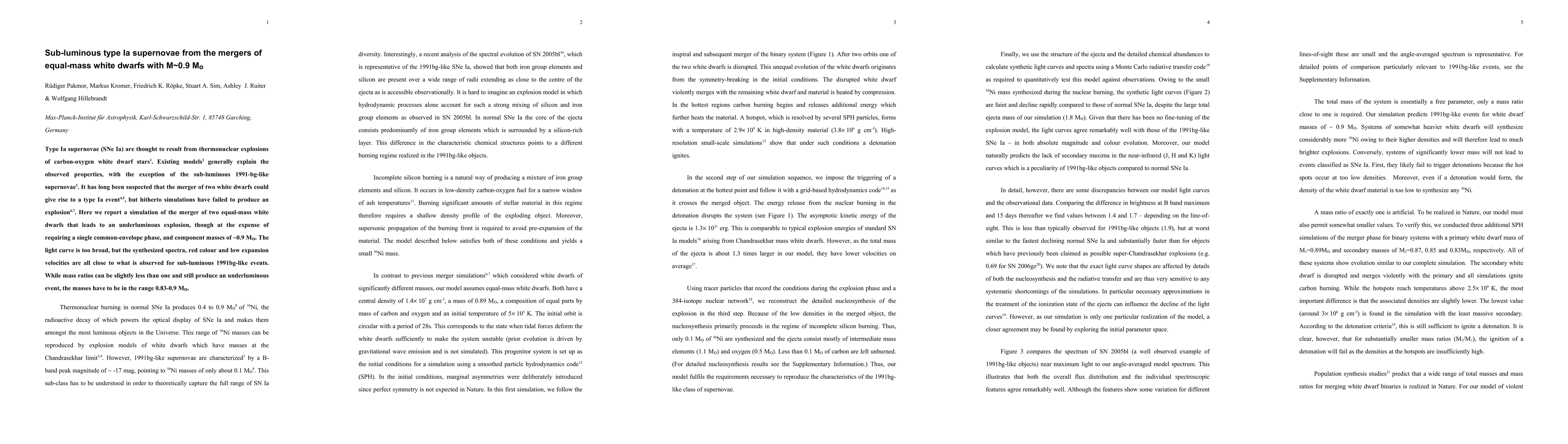 Researchers simulate the merger of two equal-mass white dwarfs and find a possible explanation for sub-luminous Type Ia supernovae, requiring masses between 0.83-0.9 M_sun to produce an underluminous explosion.