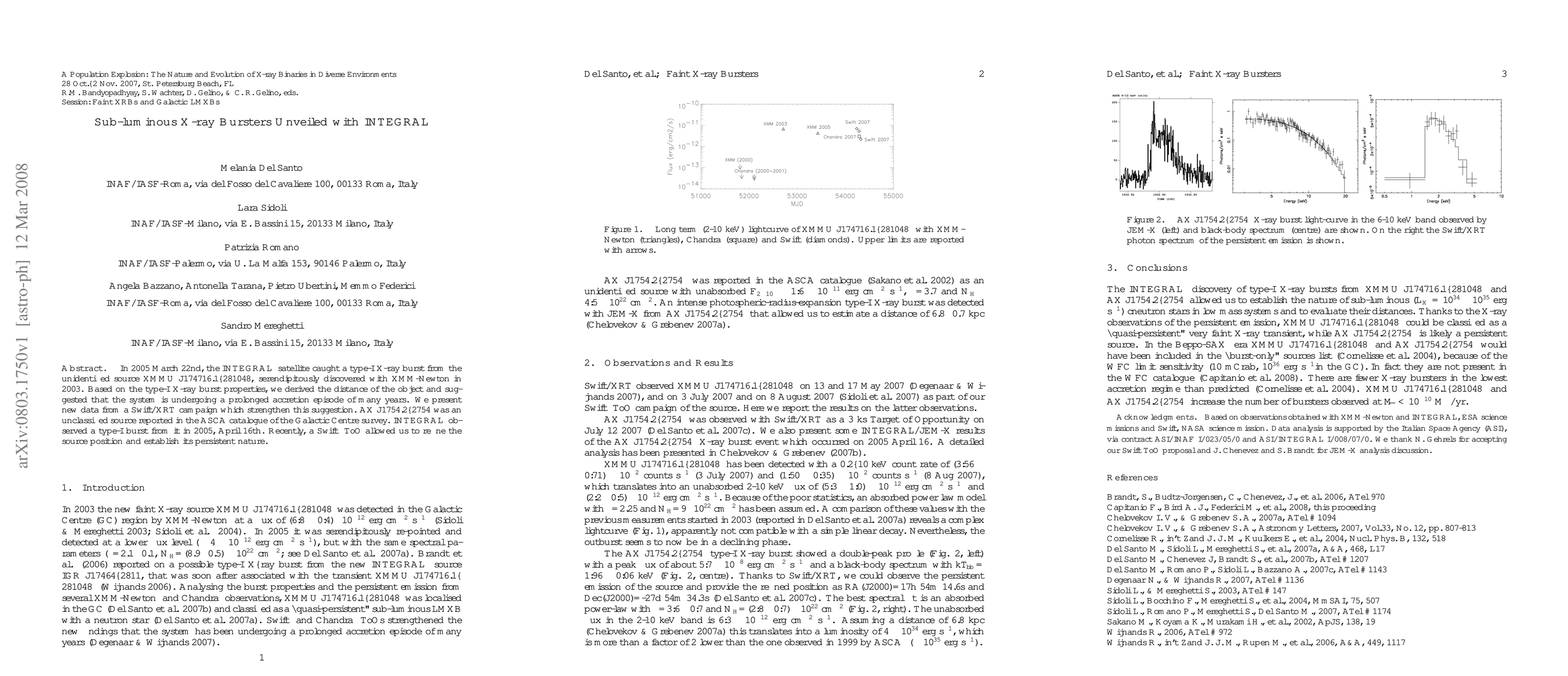 In 2005 March 22nd, the INTEGRAL satellite caught a type-I X-ray burst from the unidentified source XMMU J174716.1-281048, serendipitously discovered with XMM-Newton in 2003. Based on the type-I X-ray burst properties, we derived the distance of the object and suggested that the system is undergoing a prolonged accretion episode of many years. We present new data from a Swift/XRT campaign which strengthen this suggestion. AX J1754.2-2754 was an unclassified source reported in the ASCA catalogue of the Galactic Centre survey. INTEGRAL observed a type-I burst from it in 2005, April 16th. Recently, a Swift ToO allowed us to refine the source position and establish its persistent nature.