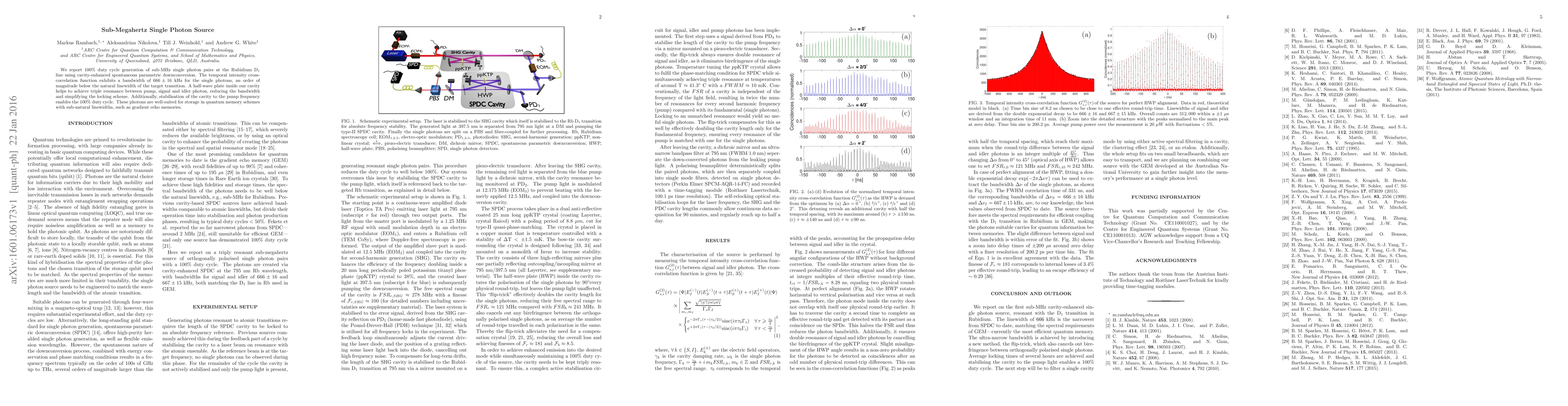 We report 100% duty cycle generation of sub-MHz single photon pairs at the Rubidium D$_1$ line using cavity-enhanced spontaneous parametric downconversion. The temporal intensity crosscorrelation function exhibits a bandwidth of $666 \pm 16$ kHz for the single photons, an order of magnitude below the natural linewidth of the target transition. A half-wave plate inside our cavity helps to achieve triple resonance between pump, signal and idler photon, reducing the bandwidth and simplifying the locking scheme. Additionally, stabilisation of the cavity to the pump frequency enables the 100% duty cycle. These photons are well-suited for storage in quantum memory schemes with sub-natural linewidths, such as gradient echo memories.