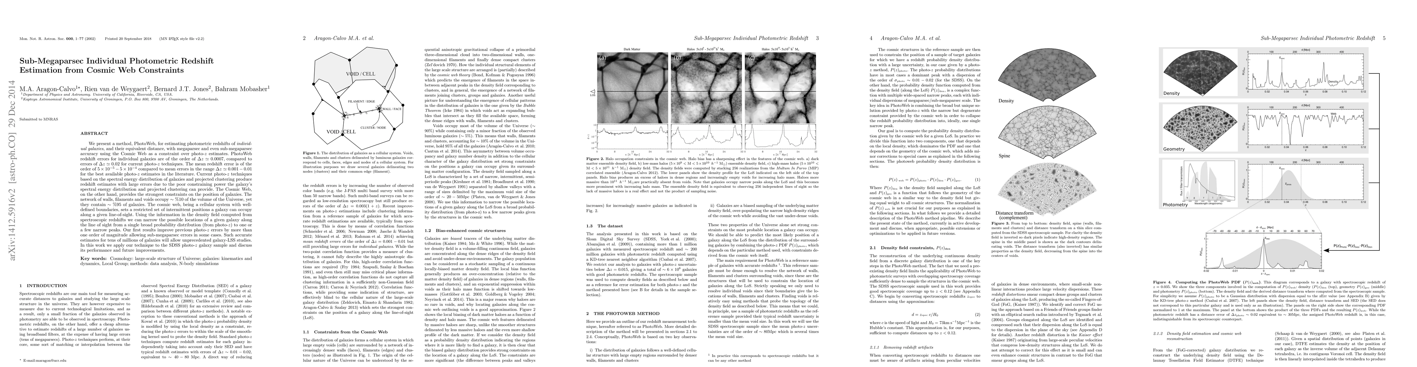 We present a method, PhotoWeb, for estimating photometric redshifts of individual galaxies, and their equivalent distance, with megaparsec and even sub-megaparsec accuracy using the Cosmic Web as a constraint over photo-z estimates. PhotoWeb redshift errors for individual galaxies are of the order of delta_z = 0.0007, compared to errors of delta_z = 0.02 for current photo-z techniques. The mean redshift error is of the order of 0.00005-0.0004 compared to mean errors in the range delta_z =z 0.001-0.01 for the best available photo-z estimates in the literature. Current photo-z techniques based on the spectral energy distribution of galaxies and projected clustering produce redshift estimates with large errors due to the poor constraining power the galaxy's spectral energy distribution and projected clustering can provide. The Cosmic Web, on the other hand, provides the strongest constraints on the position of galaxies. The network of walls, filaments and voids occupy ~%10 of the volume of the Universe, yet they contain ~%95 of galaxies. The cosmic web, being a cellular system with well-defined boundaries, sets a restricted set of intermittent positions a galaxy can occupy along a given line-of-sight. Using the information in the density field computed from spectroscopic redshifts we can narrow the possible locations of a given galaxy along the line of sight from a single broad probability distribution (from photo-z) to one or a few narrow peaks. Our first results improve previous photo-z errors by more than one order of magnitude allowing sub-megaparsec errors in some cases. Such accurate estimates for tens of millions of galaxies will allow unprecedented galaxy-LSS studies. In this work we apply our technique to the SDSS photo-z galaxy sample and discuss its performance and future improvements.