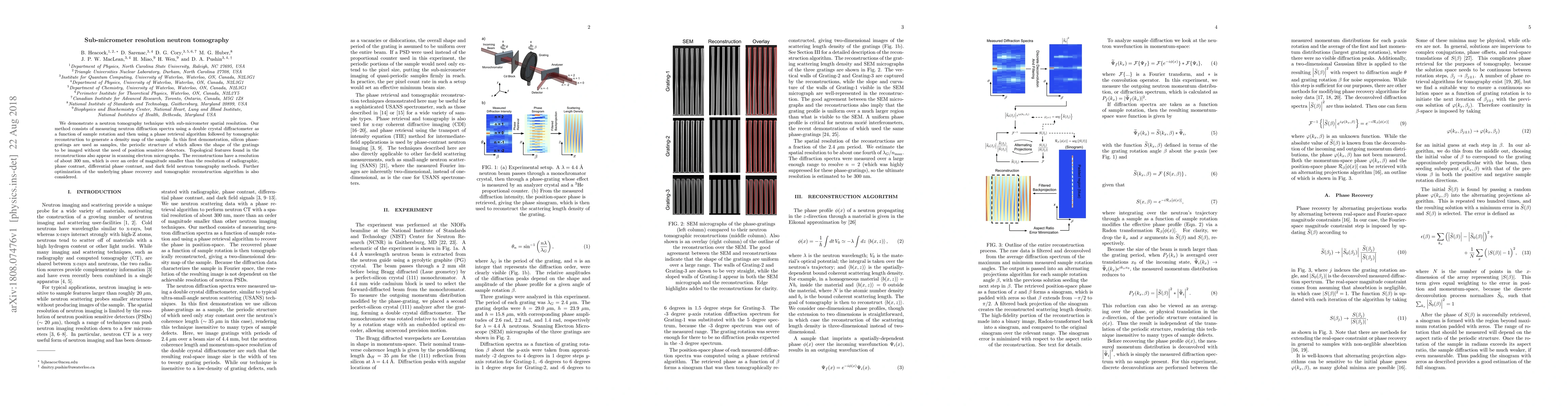 We demonstrate a neutron tomography technique with sub-micrometer spatial resolution. Our method consists of measuring neutron diffraction spectra using a double crystal diffractometer as a function of sample rotation and then using a phase retrieval algorithm followed by tomographic reconstruction to generate a density map of the sample. In this first demonstration, silicon phase-gratings are used as samples, the periodic structure of which allows the shape of the gratings to be imaged without the need of position sensitive detectors. Topological features found in the reconstructions also appear in scanning electron micrographs. The reconstructions have a resolution of about 300 nm, which is over an order of magnitude smaller than the resolution of radiographic, phase contrast, differential phase contrast, and dark field neutron tomography methods. Further optimization of the underlying phase recovery and tomographic reconstruction algorithm is also considered.