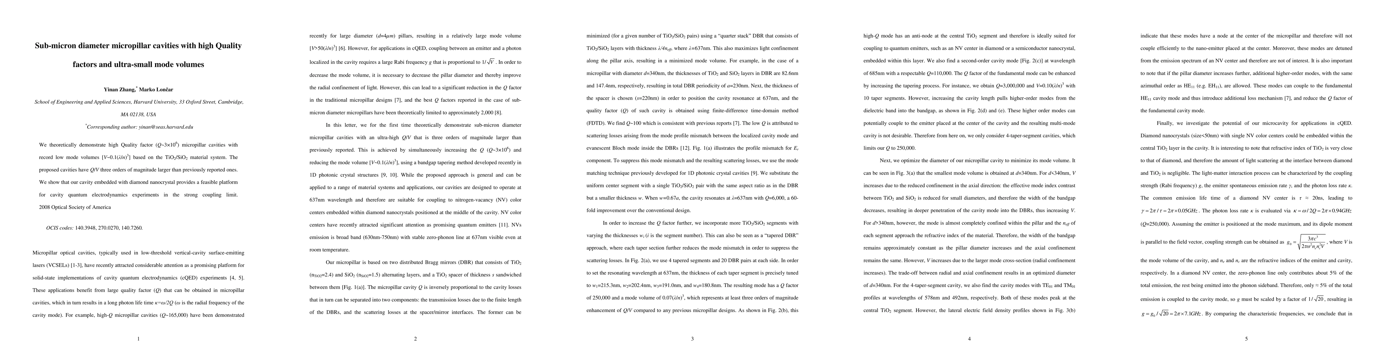 This paper theoretically proposes high-quality micropillar cavities made from TiO2/SiO2 with exceptionally low mode volumes and high quality factors, significantly outperforming previous designs. The embedded diamond nanocrystals suggest a promising platform for strong coupling cavity quantum electrodynamics experiments.