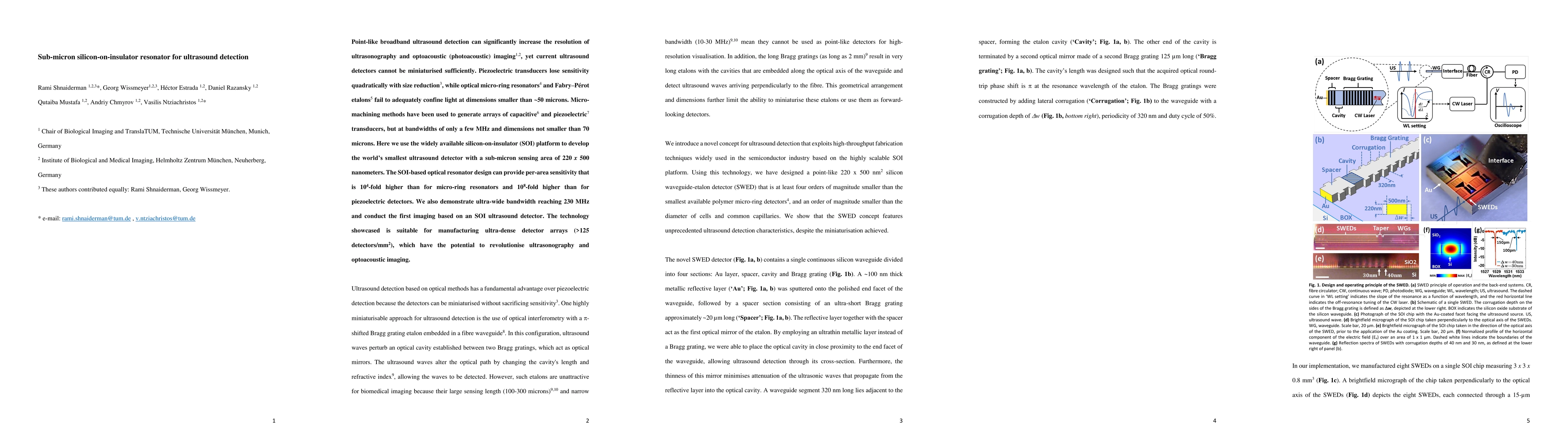 This paper presents a sub-micron silicon-on-insulator (SOI) resonator for ultrasound detection, achieving a sensing area of 220 × 500 nanometers and a sensitivity $10^{4}$-fold higher than micro-ring resonators and $10^{8}$-fold higher than piezoelectric detectors. The SOI-based design offers an ultra-wide bandwidth of 230 MHz and enables ultra-dense detector arrays, potentially revolutionizing ultrasonography and optoacoustic imaging.