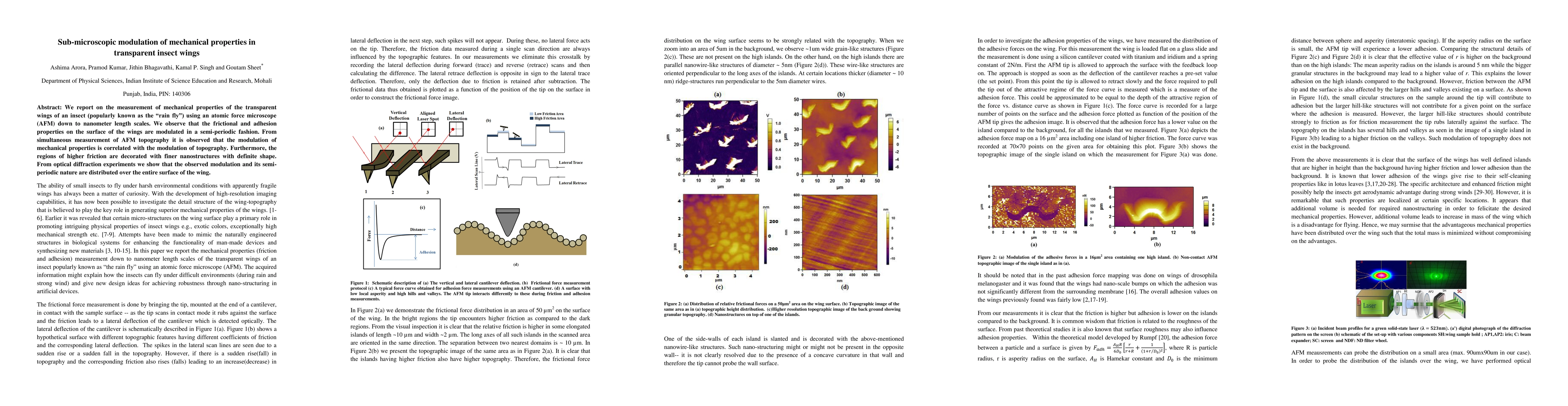 We report on the measurement of mechanical properties of the transparent wings of an insect (popularly known as the 'rain fly') using an atomic force microscope (AFM) down to nanometer length scales. We observe that the frictional and adhesion properties on the surface of the wings are modulated in a semi-periodic fashion. From simultaneous measurement of AFM topography it is observed that the modulation of mechanical properties is correlated with the modulation of topography. Furthermore, the regions of higher friction are decorated with finer nanostructures with definite shape. From optical diffraction experiments we show that the observed modulation and its semi-periodic nature are distributed over the entire surface of the wing.