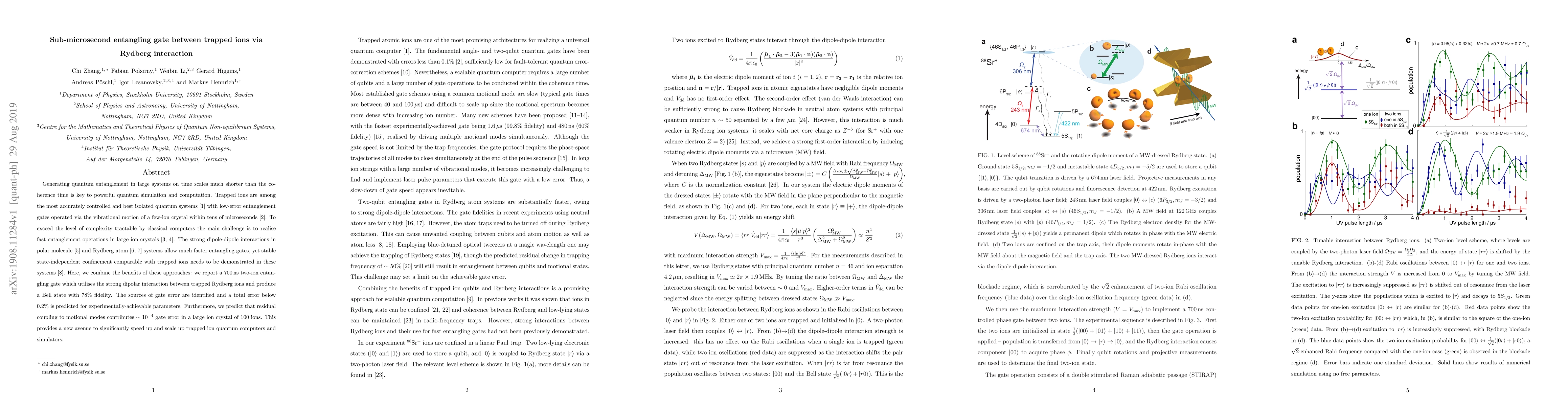 Generating quantum entanglement in large systems on time scales much shorter than the coherence time is key to powerful quantum simulation and computation. Trapped ions are among the most accurately controlled and best isolated quantum systems with low-error entanglement gates operated via the vibrational motion of a few-ion crystal within tens of microseconds. To exceed the level of complexity tractable by classical computers the main challenge is to realise fast entanglement operations in large ion crystals. The strong dipole-dipole interactions in polar molecule and Rydberg atom systems allow much faster entangling gates, yet stable state-independent confinement comparable with trapped ions needs to be demonstrated in these systems. Here, we combine the benefits of these approaches: we report a $700\,\mathrm{ns}$ two-ion entangling gate which utilises the strong dipolar interaction between trapped Rydberg ions and produce a Bell state with $78\%$ fidelity. The sources of gate error are identified and a total error below $0.2\%$ is predicted for experimentally-achievable parameters. Furthermore, we predict that residual coupling to motional modes contributes $\sim 10^{-4}$ gate error in a large ion crystal of 100 ions. This provides a new avenue to significantly speed up and scale up trapped ion quantum computers and simulators.