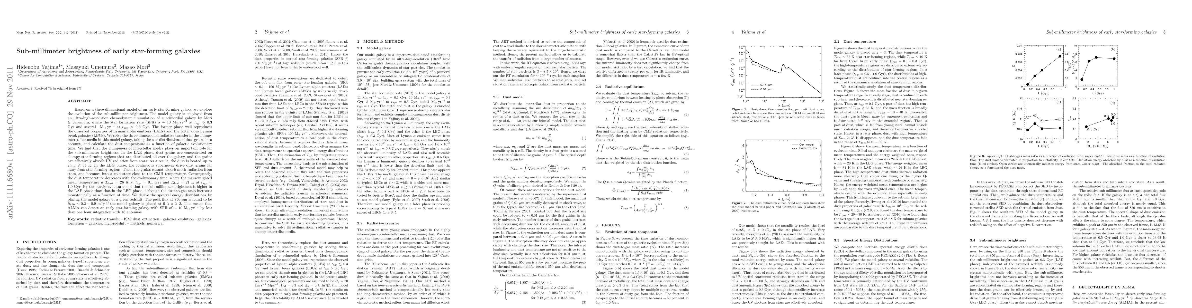 Based on a three-dimensional model of an early star-forming galaxy, we explore the evolution of the sub-millimeter brightness. The model galaxy is employed from an ultra-high-resolution chemodynamic simulation of a primordial galaxy by Mori & Umemura, where the SFR is ~ 10 Msun/yr at t<0.3 Gyr and several Msun/yr at t>0.3 Gyr. The former phase well reproduces the observed properties of LAEs and the latter does LBGs. We solve the three-dimensional radiative transfer in the clumpy interstellar media in this model galaxy, taking the size distributions of dust grains into account, and calculate the dust temperature as a function of galactic evolutionary time. We find that the clumpiness of interstellar media plays an important role for the sub-millimeter brightness. In the LAE phase, dust grains are concentrated on clumpy star-forming regions that are distributed all over the galaxy, and the grains can effectively absorb UV radiation from stars. As a result, the dust is heated up to T>35 K. In the LBG phase, the continuous supernovae drive dust grains far away from star-forming regions. Then, the grains cannot absorb much radiation from stars, and becomes into a cold state close to the CMB temperature. Consequently, the dust temperature decreases with the evolutionary time, where the mass-weighted mean temperature is T=26 K at t=0.1 Gyr and T=21 K at t=1.0 Gyr. By this analysis, it turns out that the sub-millimeter brightness is higher in the LAE phase than that in the LBG phase, although the dust-to-gas ratio increases monotonically as a function of time. We derive the spectral energy distributions by placing the model galaxy at a given redshift. The peak flux at 850 micron is found to be S_850 ~ 0.2 - 0.9 mJy if the model galaxy is placed at 6>z>2. This means that ALMA can detect an early star-forming galaxy with SFR of ~ 10 Msun/yr by less than one hour integration with 16 antennas.