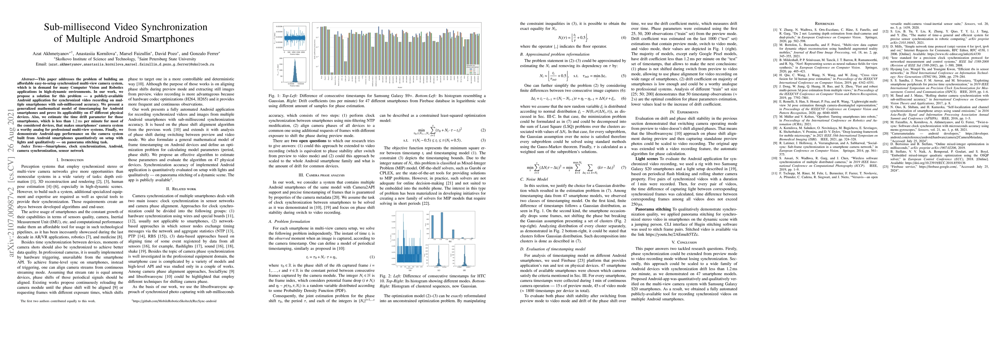 This paper addresses the problem of building an affordable easy-to-setup synchronized multi-view camera system, which is in demand for many Computer Vision and Robotics applications in high-dynamic environments. In our work, we propose a solution for this problem -- a publicly-available Android application for synchronized video recording on multiple smartphones with sub-millisecond accuracy. We present a generalized mathematical model of timestamping for Android smartphones and prove its applicability on 47 different physical devices. Also, we estimate the time drift parameter for those smartphones, which is less than 1.2 msec per minute for most of the considered devices, that makes smartphones' camera system a worthy analog for professional multi-view systems. Finally, we demonstrate Android-app performance on the camera system built from Android smartphones quantitatively on setup with lights and qualitatively -- on panorama stitching task.