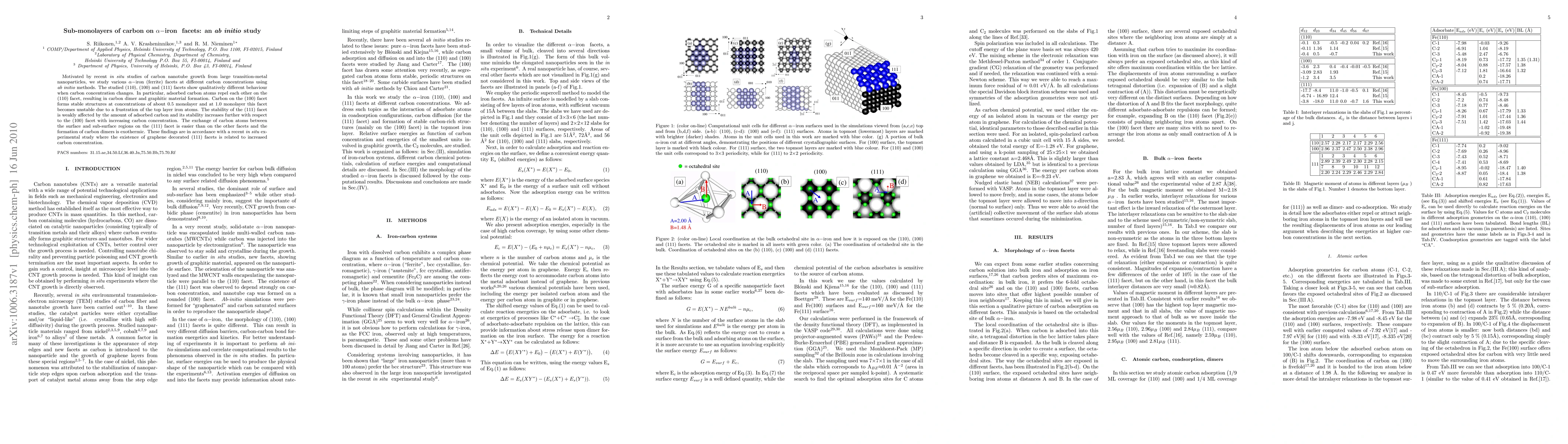 This ab-initio study investigates the behavior of carbon sub-monolayers on different alpha-iron facets, revealing distinct carbon interactions and stability changes. The (111) facet shows enhanced stability and carbon dimer formation, while the (100) facet becomes unstable at higher carbon concentrations.