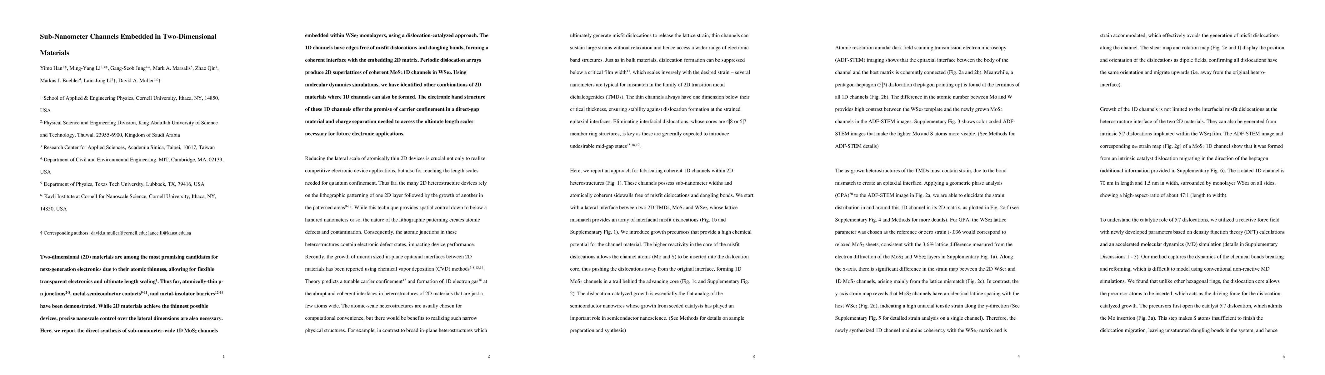 Two-dimensional (2D) materials are among the most promising candidates for next-generation electronics due to their atomic thinness, allowing for flexible transparent electronics and ultimate length scaling. Thus far, atomically-thin p-n junctions, metal-semiconductor contacts, and metal-insulator barriers have been demonstrated. While 2D materials achieve the thinnest possible devices, precise nanoscale control over the lateral dimensions is also necessary. Here, we report the direct synthesis of sub-nanometer-wide 1D MoS2 channels embedded within WSe2 monolayers, using a dislocation-catalyzed approach. The 1D channels have edges free of misfit dislocations and dangling bonds, forming a coherent interface with the embedding 2D matrix. Periodic dislocation arrays produce 2D superlattices of coherent MoS2 1D channels in WSe2. Using molecular dynamics simulations, we have identified other combinations of 2D materials where 1D channels can also be formed. The electronic band structure of these 1D channels offer the promise of carrier confinement in a direct-gap material and charge separation needed to access the ultimate length scales necessary for future electronic applications.