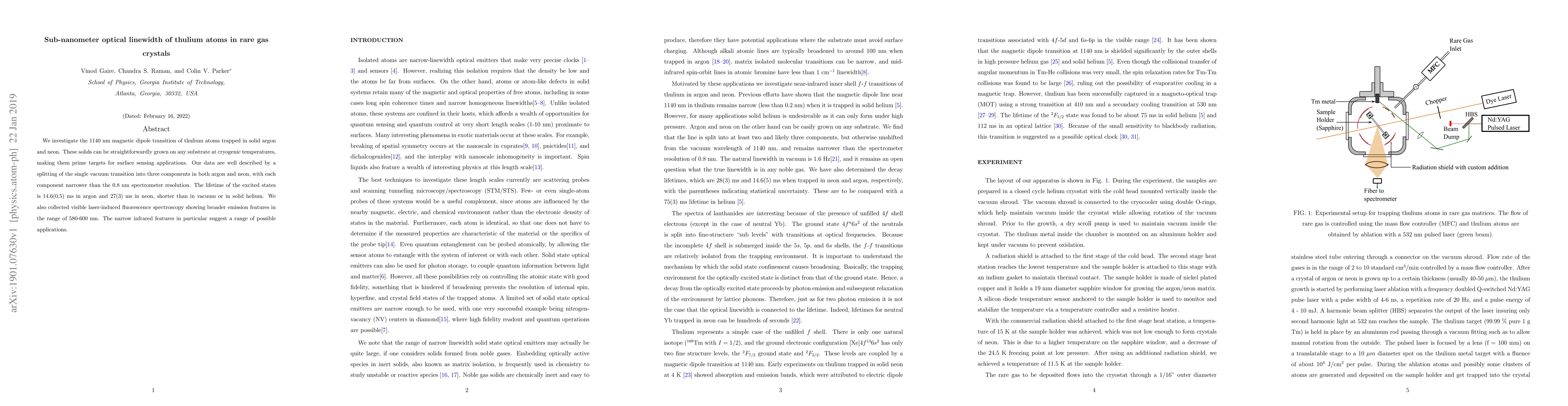 We investigate the 1140 nm magnetic dipole transition of thulium atoms trapped in solid argon and neon. These solids can be straightforwardly grown on any substrate at cryogenic temperatures, making them prime targets for surface sensing applications. Our data are well described by a splitting of the single vacuum transition into three components in both argon and neon, with each component narrower than the 0.8 nm spectrometer resolution. The lifetime of the excited states is 14.6(0.5) ms in argon and 27(3) ms in neon, shorter than in vacuum or in solid helium. We also collected visible laser-induced fluorescence spectroscopy showing broader emission features in the range of 580-600 nm. The narrow infrared features in particular suggest a range of possible applications.