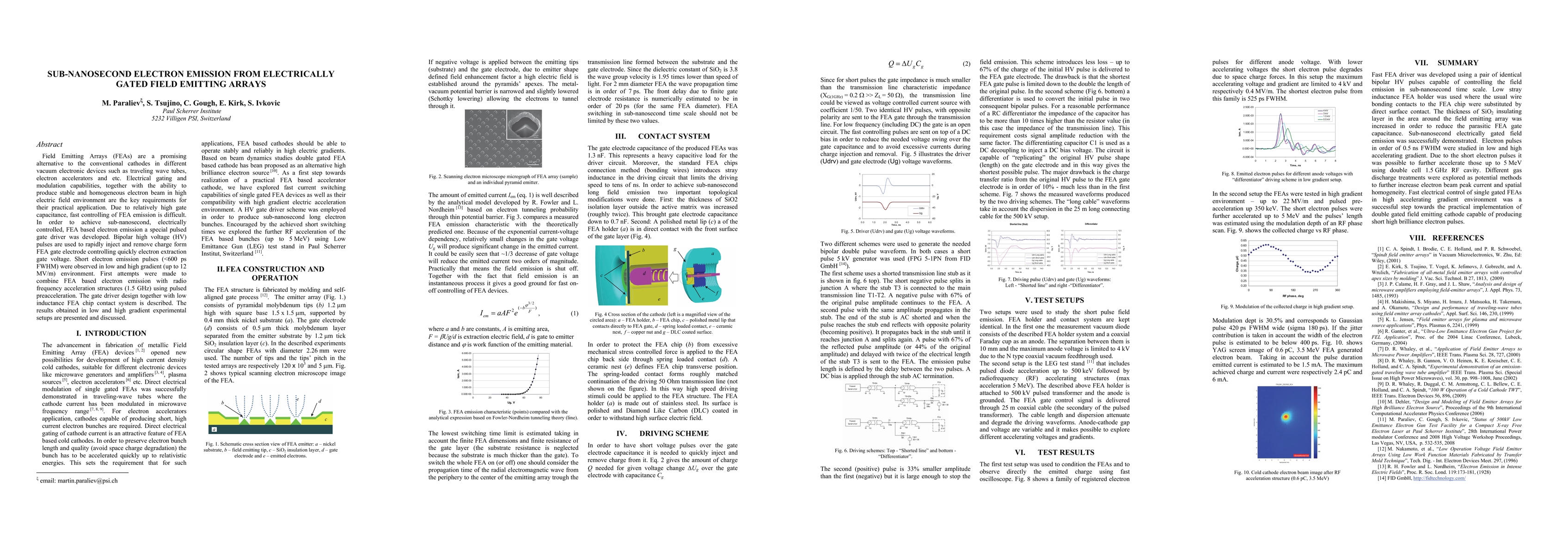 Field Emitting Arrays (FEAs) are a promising alternative to the conventional cathodes in different vacuum electronic devices such as traveling wave tubes, electron accelerators and etc. Electrical gating and modulation capabilities, together with the ability to produce stable and homogeneous electron beam in high electric field environment are the key requirements for their practical application. Due to relatively high gate capacitance, fast controlling of FEA emission is difficult. In order to achieve sub-nanosecond, electrically controlled, FEA based electron emission a special pulsed gate driver was developed. Bipolar high voltage (HV)pulses are used to rapidly inject and remove charge form FEA gate electrode controlling quickly electron extraction gate voltage. Short electron emission pulses (<600 ps FWHM) were observed in low and high gradient (up to 12 MV/m) environment. First attempts were made to combine FEA based electron emission with radio frequency acceleration structures (1.5 GHz) using pulsed preacceleration. The gate driver design together with low inductance FEA chip contact system is described. The results obtained in low and high gradient experimental setups are presented and discussed.