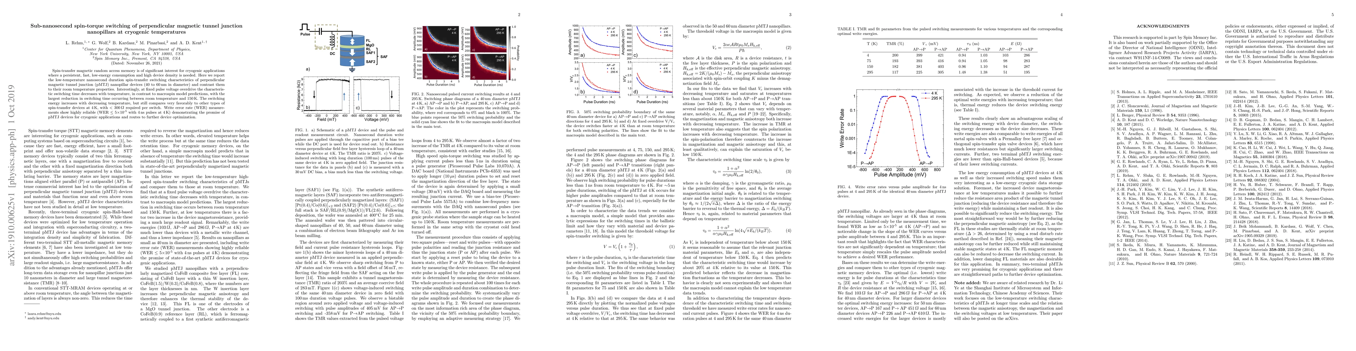 This paper reports on the sub-nanosecond spin-torque switching of nanoscale perpendicular magnetic tunnel junction devices at cryogenic temperatures, revealing reduced switching times and reliable performance even at 4 K, with very low switching energy and minimal write error rates. The findings suggest strong potential for these devices in low-temperature applications.
