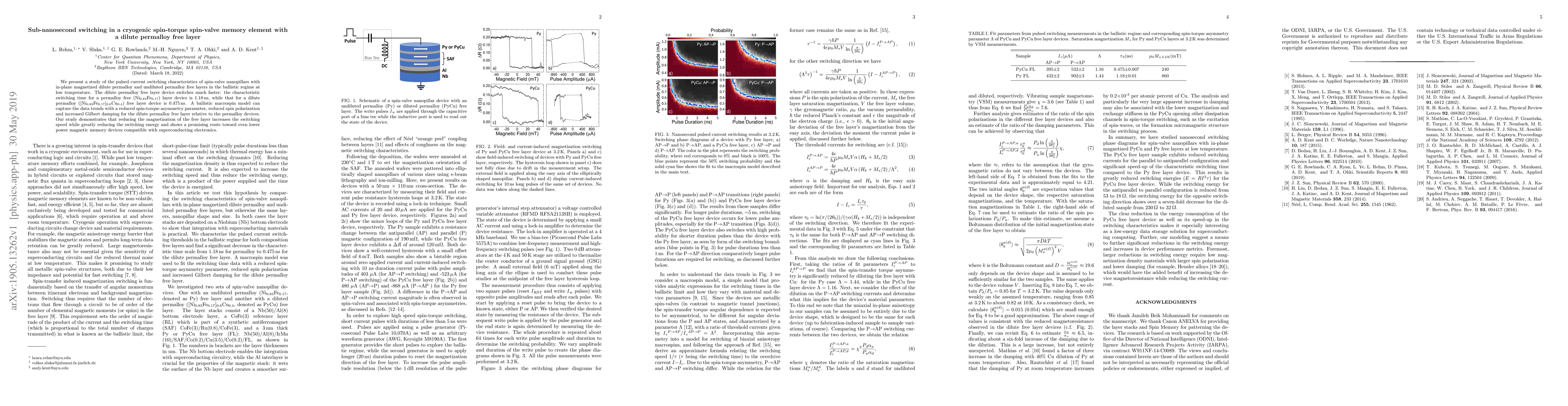 This study investigates the switching characteristics of spin-valve nanopillars with dilute permalloy free layers, finding sub-nanosecond switching times. The dilute permalloy device switches faster (0.475 ns) compared to undiluted permalloy (1.18 ns), suggesting reduced switching energy and a potential pathway for low-power magnetic memory compatible with superconducting electronics.
