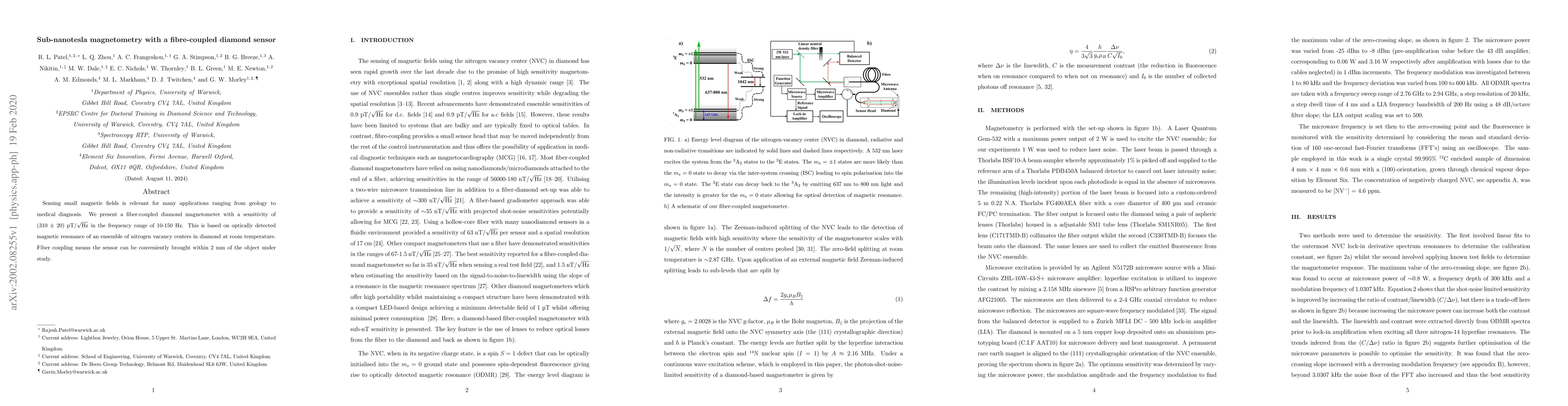 A diamond sensor with a sensitivity of 310 pT/sqrt(Hz) has been developed for detecting small magnetic fields, enabling applications in geology and medical diagnosis. The sensor uses optically detected magnetic resonance at room temperature.