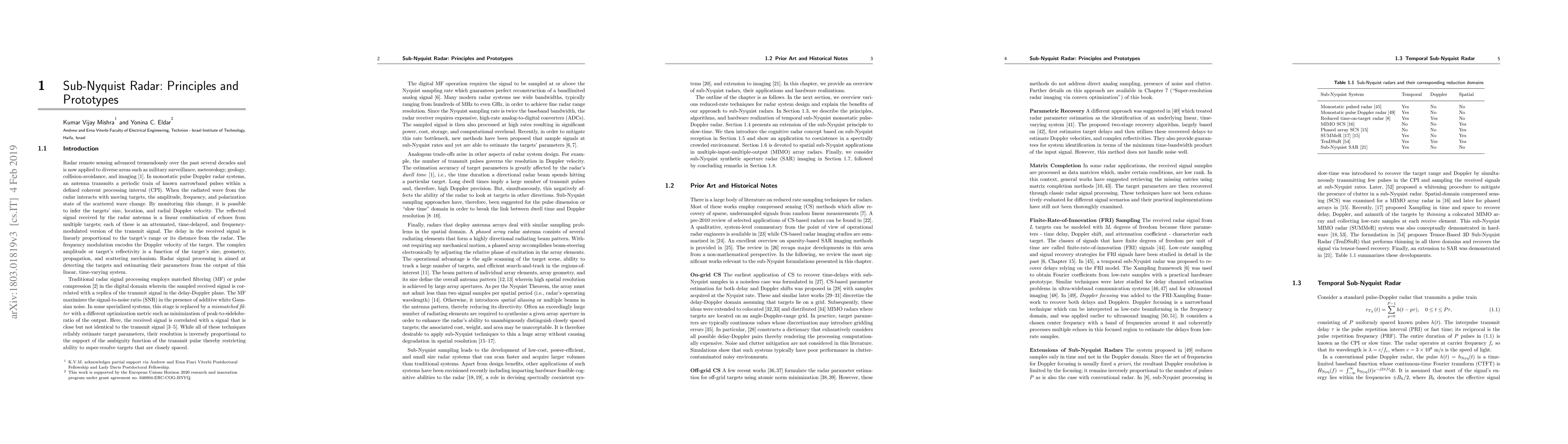 This paper reviews sub-Nyquist radar systems that utilize sparse signal processing and compressed sensing to detect targets with fewer measurements than traditional Nyquist sampling. It presents prototypes for temporal, spatial, and cognitive radars, demonstrating reduced bandwidth, dwell time, and antenna element usage while maintaining robust performance.