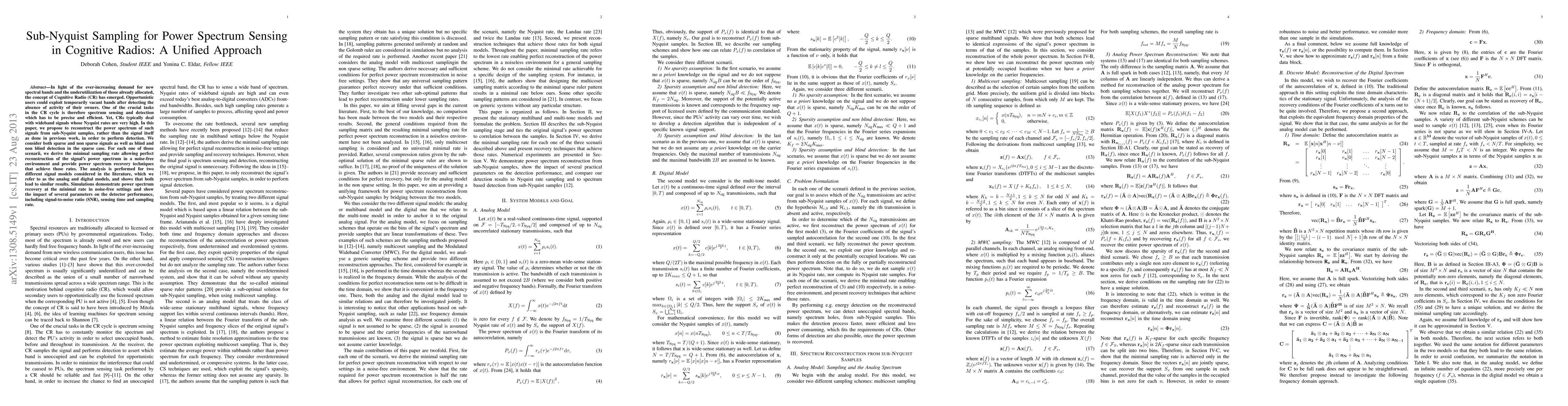 This paper proposes a method for sub-Nyquist sampling to reconstruct the power spectrum for efficient spectrum sensing in cognitive radios. It derives minimal sampling rates for perfect power spectrum reconstruction under various signal models and detection scenarios, demonstrating effective recovery in noise-free conditions and analyzing parameter impacts on detector performance.