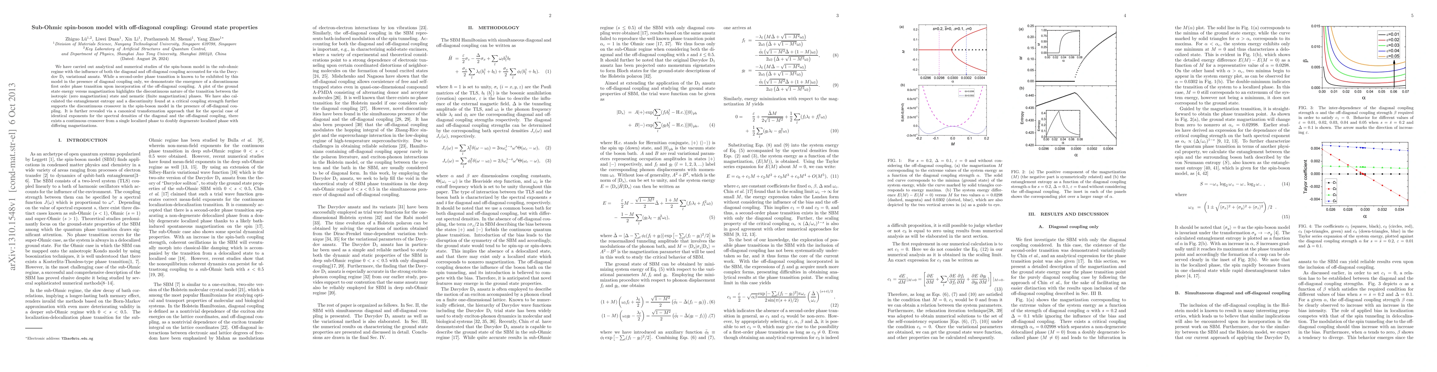 This paper investigates the spin-boson model in the sub-ohmic regime, revealing a first-order phase transition due to off-diagonal coupling, as opposed to the second-order transition seen with diagonal coupling alone. The study also finds a discontinuity in entanglement entropy at a critical coupling strength.