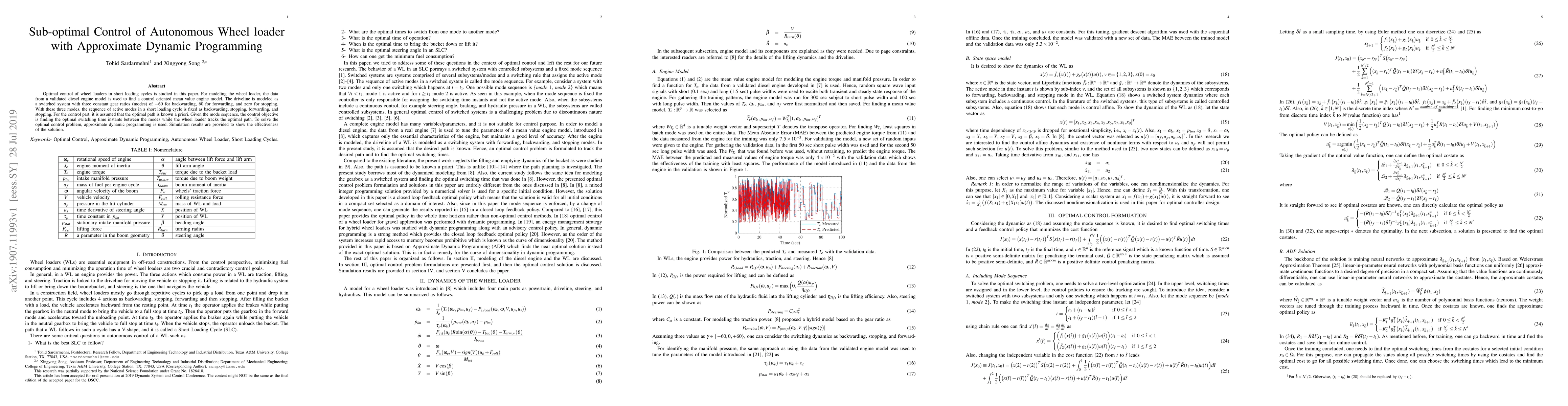 Optimal control of wheel loaders in short loading cycles is studied in this paper. For modeling the wheel loader, the data from a validated diesel engine model is used to find a control oriented mean value engine model. The driveline is modeled as a switched system with three constant gear ratios (modes) of $-60$ for backwarding, $60$ for forwarding, and zero for stopping. With these three modes, the sequence of active modes in a short loading cycle is fixed as backwarding, stopping, forwarding, and stopping. For the control part, it is assumed that the optimal path is known a priori. Given the mode sequence, the control objective is finding the optimal switching time instants between the modes while the wheel loader tracks the optimal path. To solve the optimal control problem, approximate dynamic programming is used. Simulation results are provided to show the effectiveness of the solution.