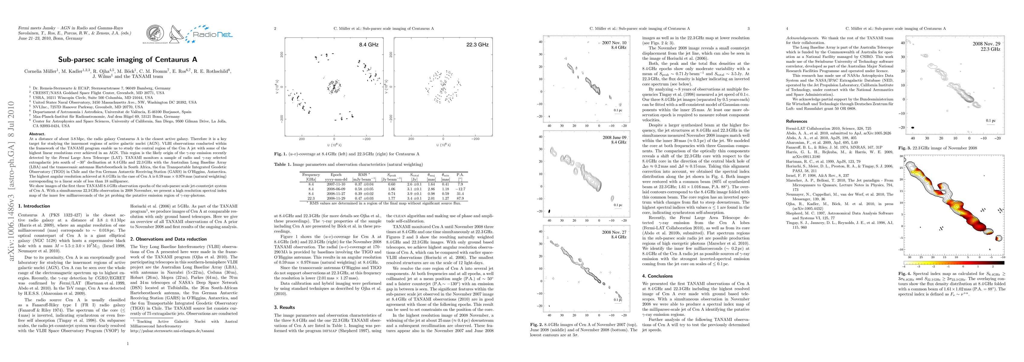 At a distance of about 3.8 Mpc, the radio galaxy Centaurus A is the closest active galaxy. Therefore it is a key target for studying the innermost regions of active galactic nuclei (AGN). VLBI observations conducted within the framework of the TANAMI program enable us to study the central region of the Cen A jet with some of the highest linear resolutions ever achieved in an AGN. This region is the likely origin of the gamma-ray emission recently detected by the Fermi Large Area Telescope (LAT). TANAMI monitors a sample of radio and gamma-ray selected extragalactic jets south of -30 degrees declination at 8.4 GHz and 22.3 GHz with the Australian Long Baseline Array (LBA) and the transoceanic antennas Hartebeesthoek in South Africa, the 6 m Transportable Integrated Geodetic Observatory (TIGO) in Chile and the 9 m German Antarctic Receiving Station (GARS) in O'Higgins, Antarctica. The highest angular resolution achieved at 8.4 GHz in the case of Cen A is 0.59mas x 0.978mas (natural weighting) corresponding to a linear scale of less than 18 milliparsec. We show images of the first three TANAMI 8.4 GHz observation epochs of the sub-parsec scale jet-counterjet system of Cen A. With a simultaneous 22.3 GHz observation in 2008 November, we present a high resolution spectral index map of the inner few milliarcseconds of the jet probing the putative emission region of gamma-ray-photons.