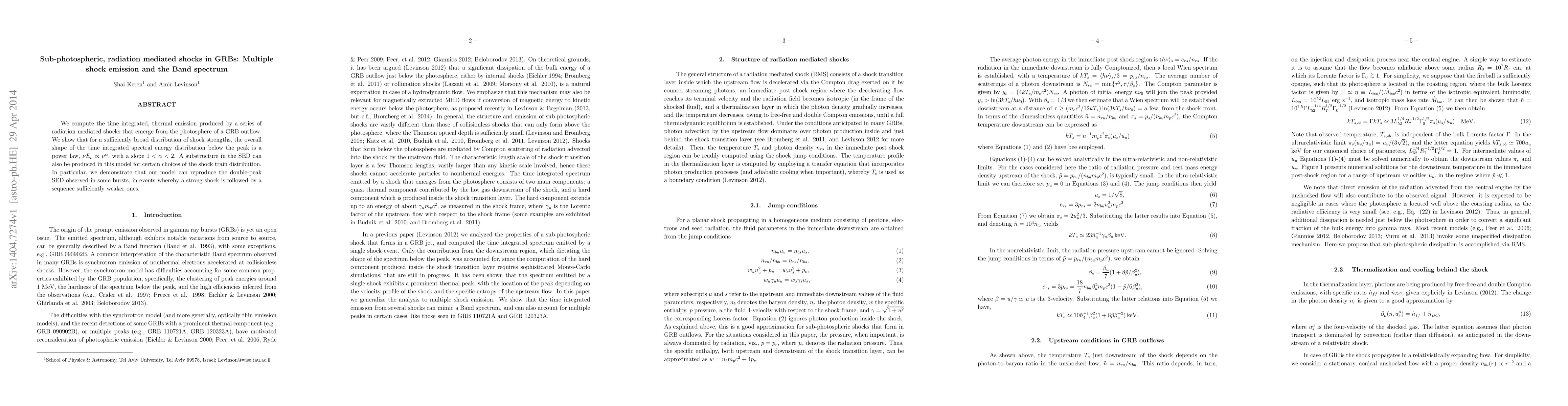 We compute the time integrated, thermal emission produced by a series of radiation mediated shocks that emerge from the photosphere of a GRB outflow. We show that for a sufficiently broad distribution of shock strengths, the overall shape of the time integrated spectral energy distribution below the peak is a power law, $\nu E_\nu\propto \nu^\alpha$, with a slope $1<\alpha<2$. A substructure in the SED can also be produced in this model for certain choices of the shock train distribution. In particular, we demonstrate that our model can reproduce the double-peak SED observed in some bursts, in events whereby a strong shock is followed by a sequence sufficiently weaker ones.