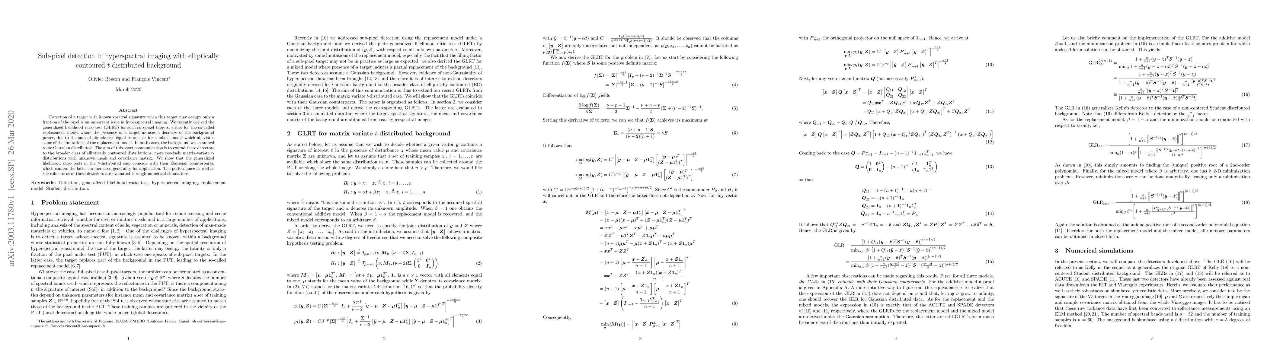 Researchers developed a new method for detecting targets in hyperspectral imaging with elliptically contoured $t$-distributed background distributions, expanding the generality of their previous work on Gaussian distributions.