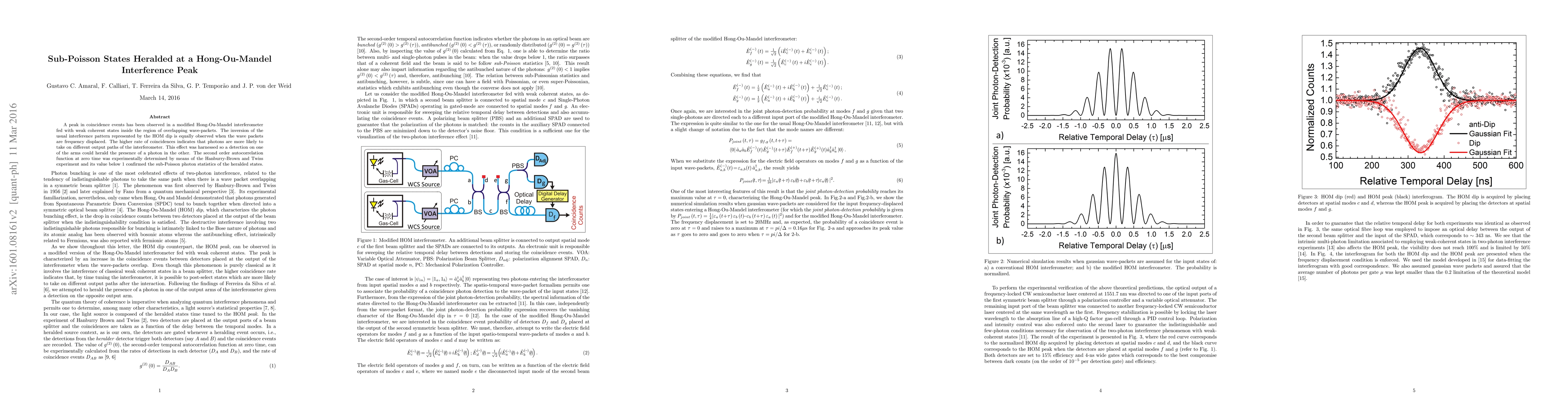 A peak in coincidence events has been observed in a modified Hong-Ou-Mandel interferometer fed with weak coherent states inside the region of overlapping wave-packets. The inversion of the usual interference pattern represented by the HOM dip is equally observed when the wave packets are frequency displaced. The higher rate of coincidences indicates that photons are more likely to take on different output paths of the interferometer. This effect was harnessed so a detection on one of the arms could herald the presence of a photon in the other. The second order autocorrelation function at zero time was experimentally determined by means of the Hanburry-Brown and Twiss experiment and its value below 1 confirmed the sub-Poisson photon statistics of the heralded states.