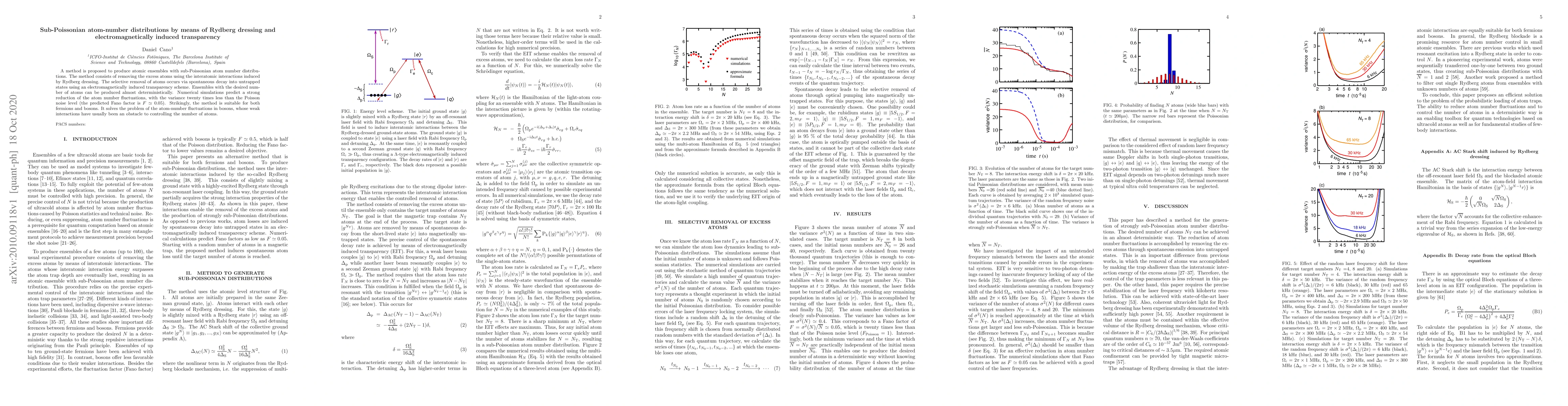 This paper proposes a method to create atomic ensembles with sub-Poissonian atom-number distributions using Rydberg dressing and electromagnetically induced transparency. The technique selectively removes excess atoms via spontaneous decay, achieving a Fano factor of 0.05, twenty times less than the Poisson noise level, and is applicable to both fermions and bosons.