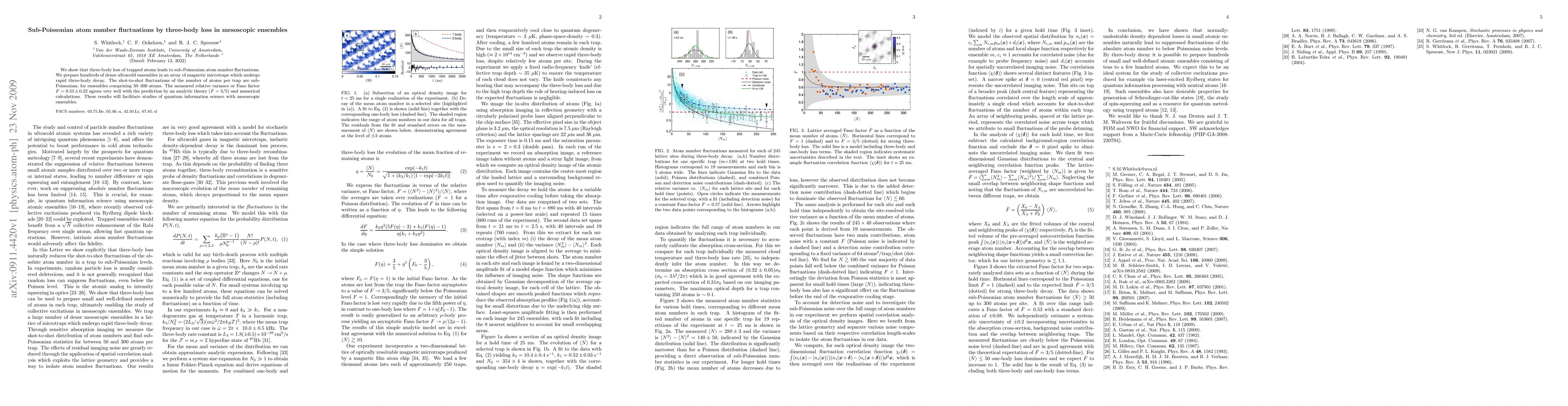 This paper demonstrates that three-body loss in dense ultracold atomic ensembles results in sub-Poissonian atom number fluctuations, with a measured Fano factor of $0.53\pm 0.22$ that aligns closely with theoretical predictions. These findings enhance the potential for quantum information science applications using mesoscopic ensembles.