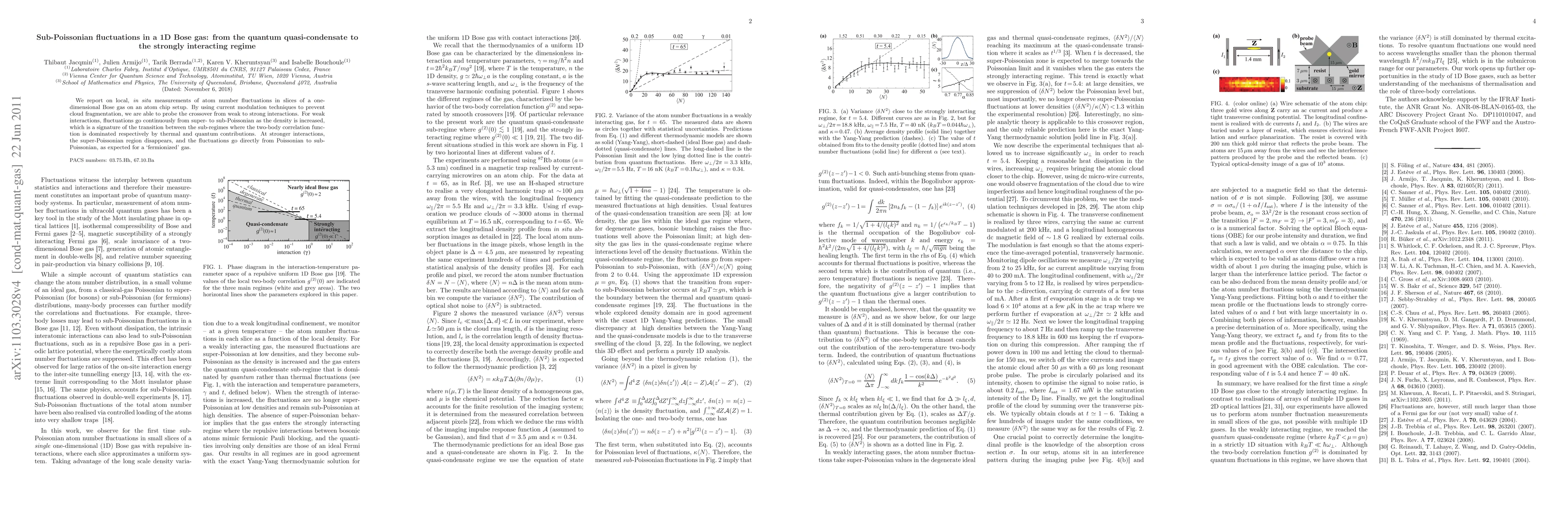 This paper investigates atom number fluctuations in a 1D Bose gas, revealing a transition from super-Poissonian to sub-Poissonian statistics as density increases, with distinct behaviors in weakly and strongly interacting regimes, mirroring Fermi gas fluctuations in the latter.