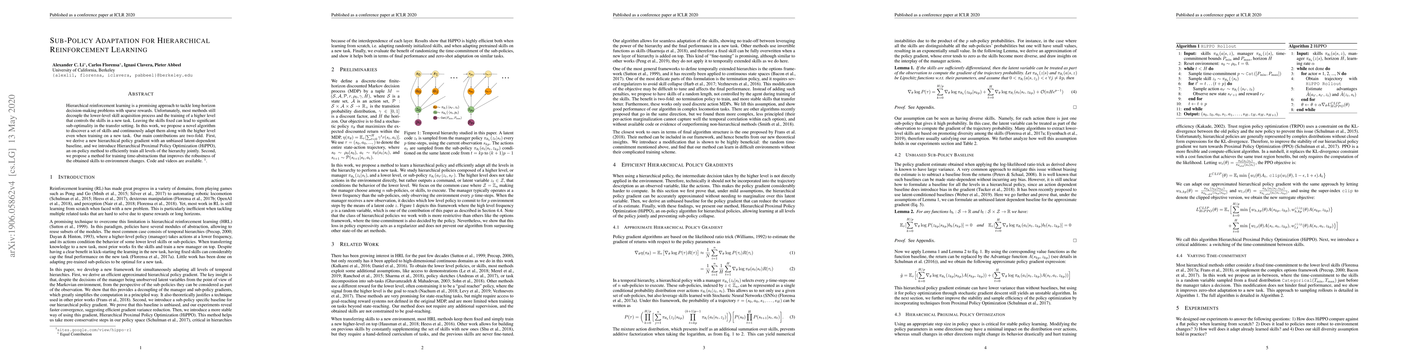 This paper proposes HiPPO, a novel hierarchical reinforcement learning algorithm that jointly trains lower-level skills and a higher-level policy using an unbiased latent-dependent baseline, and introduces a method for adapting skills to improve robustness to environment changes. The approach aims to enhance sub-policy adaptation for better transfer learning in long-horizon tasks.