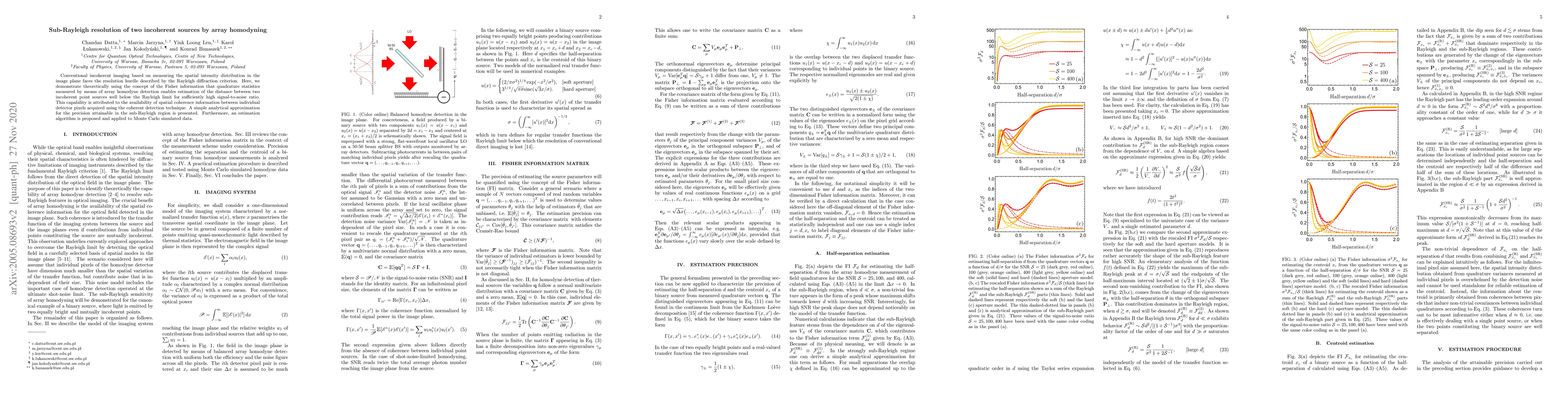 Conventional incoherent imaging based on measuring the spatial intensity distribution in the image plane faces the resolution hurdle described by the Rayleigh diffraction criterion. Here, we demonstrate theoretically using the concept of the Fisher information that quadrature statistics measured by means of array homodyne detection enables estimation of the distance between two incoherent point sources well below the Rayleigh limit for sufficiently high signal-to-noise ratio. This capability is attributed to the availability of spatial coherence information between individual detector pixels acquired using the coherent detection technique. A simple analytical approximation for the precision attainable in the sub-Rayleigh region is presented. Furthermore, an estimation algorithm is proposed and applied to Monte Carlo simulated data.