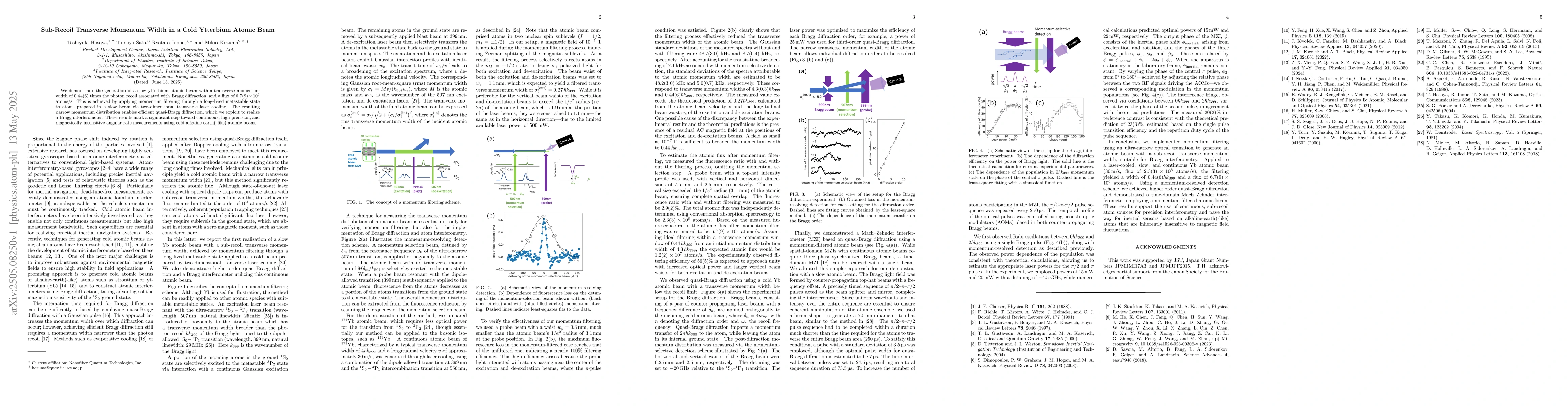 The research paper presents a method to generate a slow ytterbium atomic beam with a narrow transverse momentum distribution, 0.44(6) times the photon recoil, using momentum filtering via a metastable state after two-dimensional cooling. This achievement enables efficient Bragg diffraction, paving the way for high-precision, continuous, and magnetically insensitive angular rate measurements with cold alkaline-earth(-like) atomic beams.