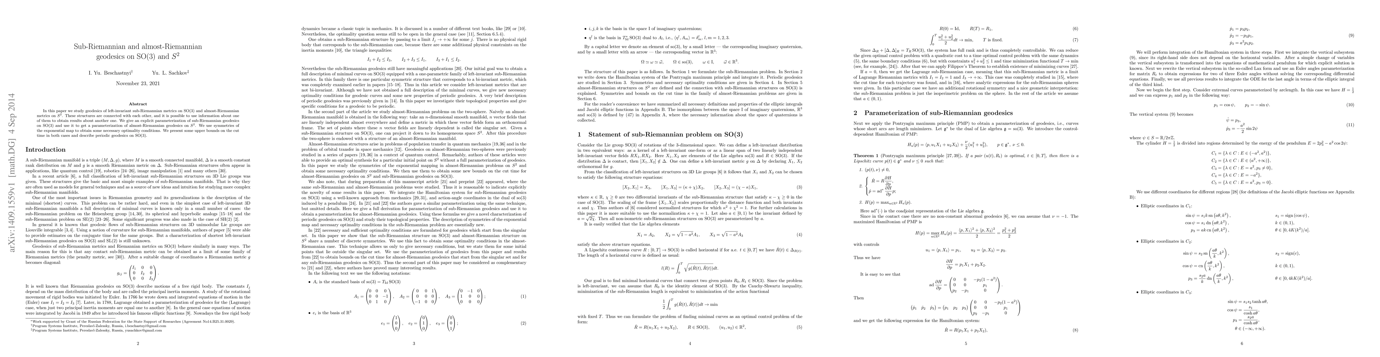 This paper investigates left-invariant sub-Riemannian geodesics on SO(3) and almost-Riemannian geodesics on $S^2$, establishing connections between the two. It provides explicit parameterizations for both types of geodesics using symmetries and presents upper bounds on the cut time.