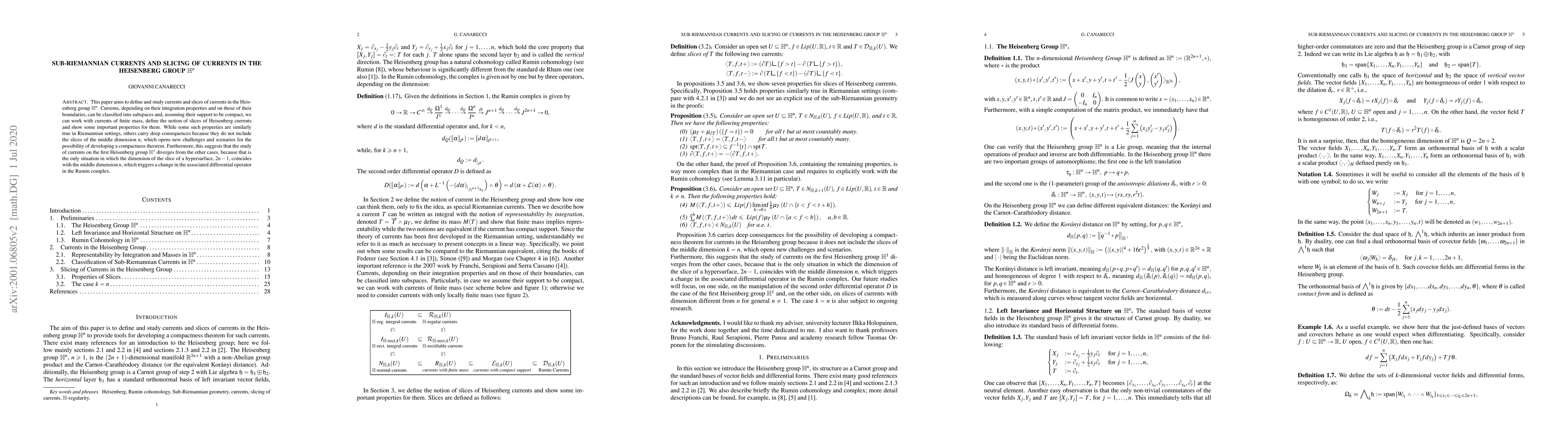 This paper aims to define and study currents and slices of currents in the Heisenberg group $\mathbb{H}^n$. Currents, depending on their integration properties and on those of their boundaries, can be classified into subspaces and, assuming their support to be compact, we can work with currents of finite mass, define the notion of slices of Heisenberg currents and show some important properties for them. While some such properties are similarly true in Riemannian settings, others carry deep consequences because they do not include the slices of the middle dimension $n$, which opens new challenges and scenarios for the possibility of developing a compactness theorem. Furthermore, this suggests that the study of currents on the first Heisenberg group $\mathbb{H}^1$ diverges from the other cases, because that is the only situation in which the dimension of the slice of a hypersurface, $2n-1$, coincides with the middle dimension $n$, which triggers a change in the associated differential operator in the Rumin complex.