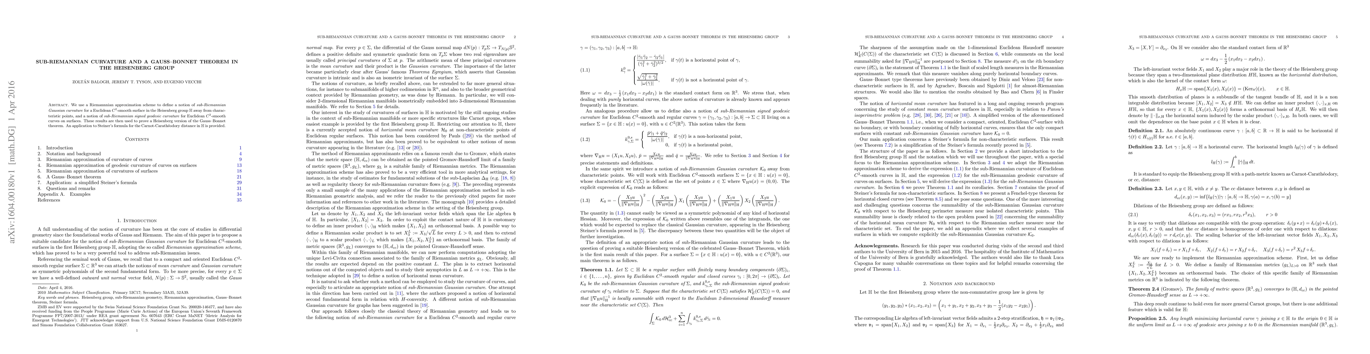 We use a Riemannnian approximation scheme to define a notion of $\textit{sub-Riemannian Gaussian curvature}$ for a Euclidean $C^{2}$-smooth surface in the Heisenberg group $\mathbb{H}$ away from characteristic points, and a notion of $\textit{sub-Riemannian signed geodesic curvature}$ for Euclidean $C^{2}$-smooth curves on surfaces. These results are then used to prove a Heisenberg version of the Gauss-Bonnet theorem. An application to Steiner's formula for the Carnot-Carath\'eodory distance in $\mathbb{H}$ is provided.