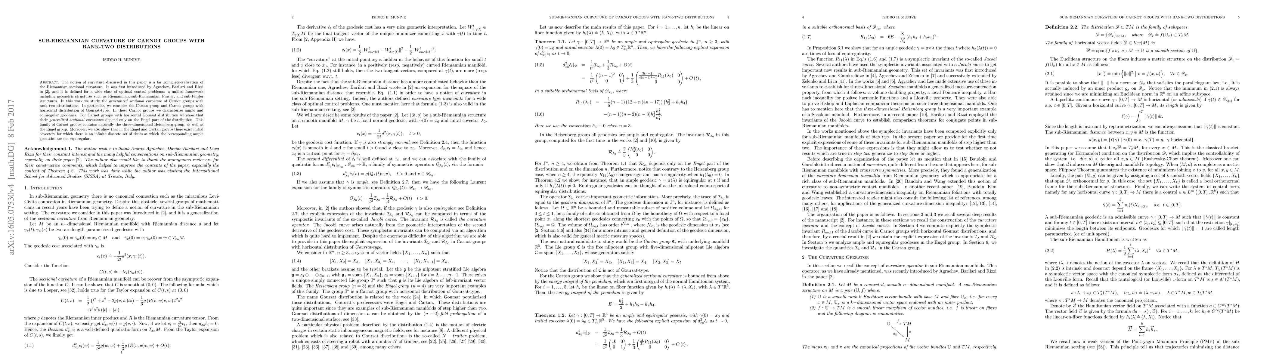 This paper generalizes the concept of Riemannian sectional curvature to sub-Riemannian structures, focusing on Carnot groups with rank-two distributions. It characterizes the generalized sectional curvatures and explores ample and equiregular geodesics, particularly in Carnot groups with horizontal Goursat distribution, revealing that curvature depends on the Engel part of the distribution.