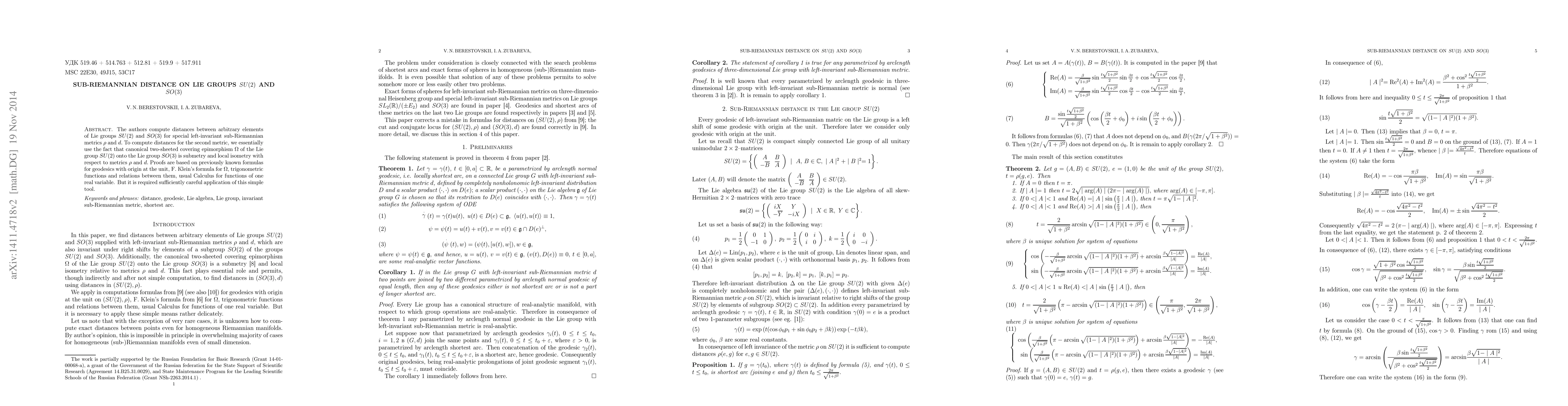 This paper computes distances between elements in Lie groups SU(2) and SO(3) using sub-Riemannian metrics, leveraging the fact that SU(2) covers SO(3) as a two-sheeted submetry and local isometry, along with careful application of trigonometric relations and calculus.