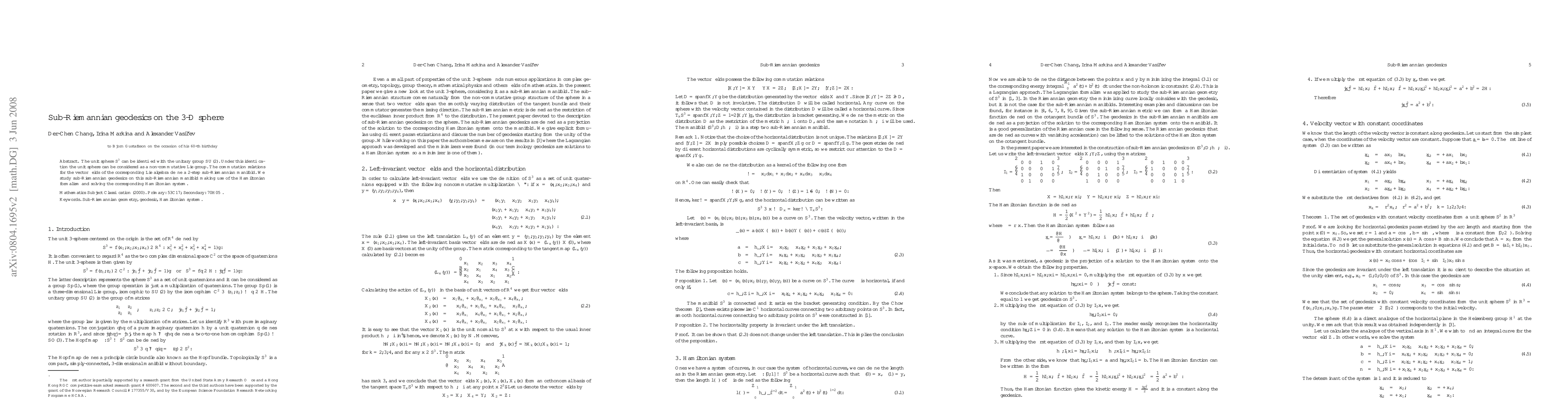 This paper investigates sub-Riemannian geodesics on the 3-D sphere identified with the SU(2) group, treating it as a non-commutative Lie group. It employs the Hamiltonian formalism to solve the associated Hamiltonian system and analyze the geodesics.