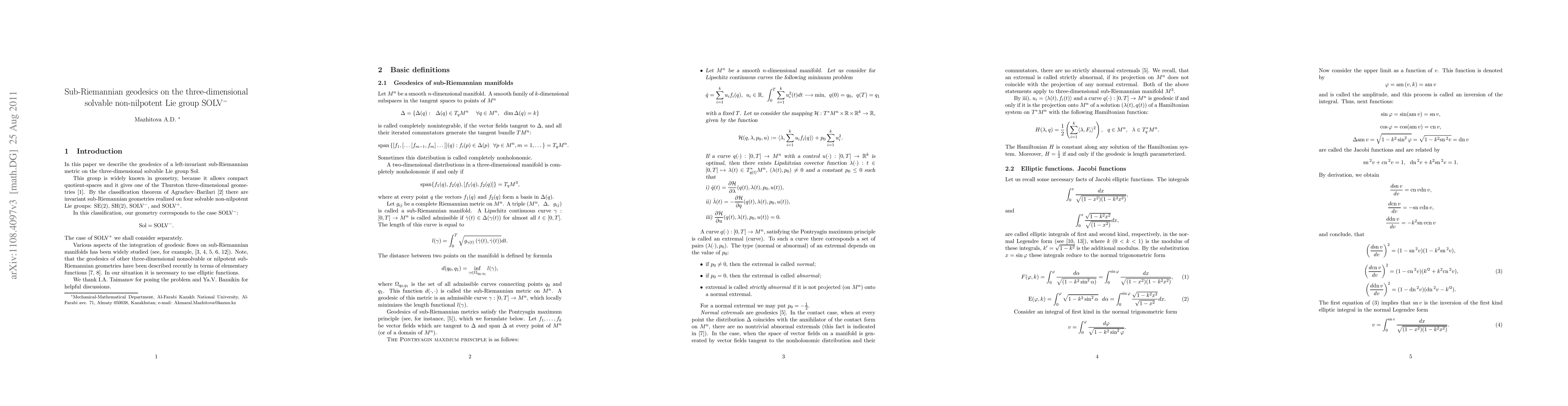 Summary: This paper investigates the geodesics of a left-invariant sub-Riemannian metric on the three-dimensional solvable non-nilpotent Lie group $SOLV^-$, providing a detailed analysis of the geometric properties inherent to this structure.