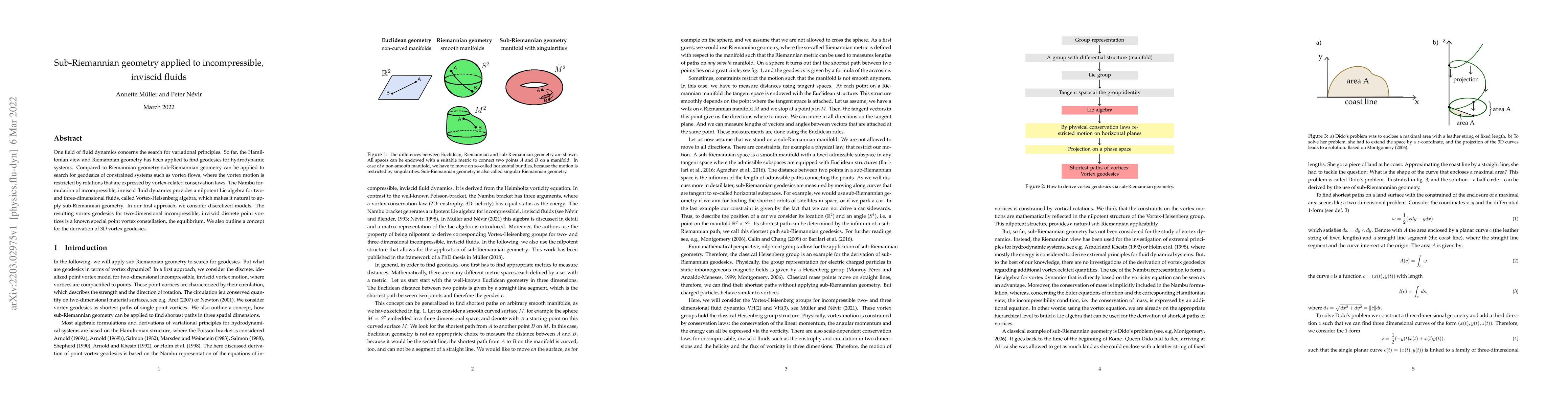One field of fluid dynamics concerns the search for variational principles. So far, the Hamiltonian view and Riemannian geometry has been applied to find geodesics for hydrodynamic systems. Compared to Riemannian geometry sub-Riemannian geometry can be applied to search for geodesics of constrained systems such as vortex flows, where the vortex motion is restricted by rotations that are expressed by vortex-related conservation laws. The Nambu formulation of incompressible, inviscid fluid dynamics provides a nilpotent Lie algebra for two- and three-dimensional fluids, called Vortex-Heisenberg algebra, which makes it natural to apply sub-Riemannian geometry. As a first approach we consider discretized models. The resulting vortex geodesics for two-dimensional incompressible, inviscid discrete point vortices is a known special point vortex constellation, the equilibrium. We also outline a concept for the derivation of 3D vortex geodesics.