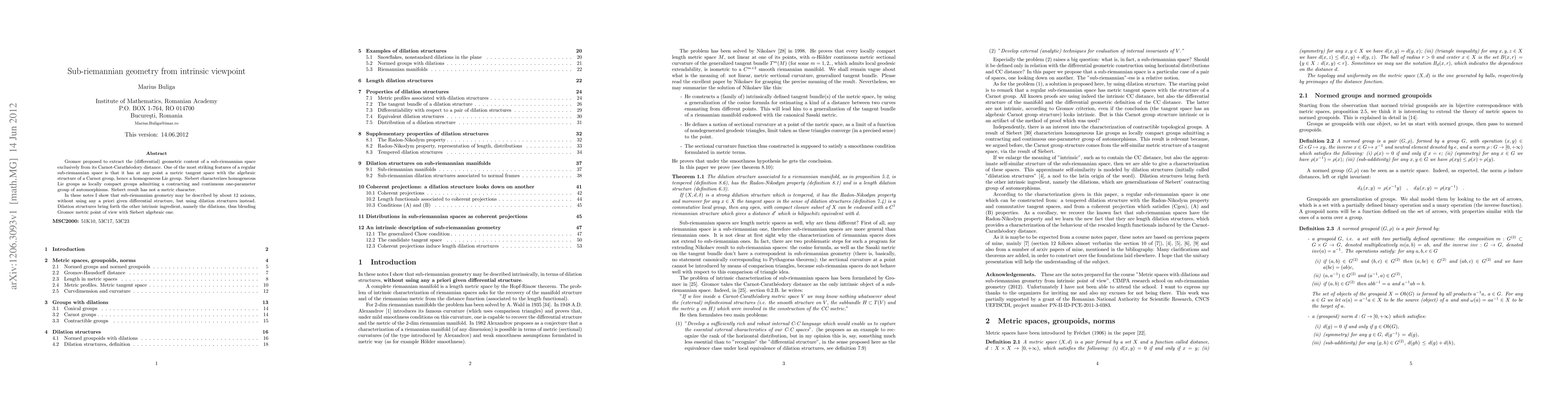 Gromov proposed to extract the (differential) geometric content of a sub-riemannian space exclusively from its Carnot-Carath\'eodory distance. One of the most striking features of a regular sub-riemannian space is that it has at any point a metric tangent space with the algebraic structure of a Carnot group, hence a homogeneous Lie group. Siebert characterizes homogeneous Lie groups as locally compact groups admitting a contracting and continuous one-parameter group of automorphisms. Siebert result has not a metric character. In these notes I show that sub-riemannian geometry may be described by about 12 axioms, without using any a priori given differential structure, but using dilation structures instead. Dilation structures bring forth the other intrinsic ingredient, namely the dilations, thus blending Gromov metric point of view with Siebert algebraic one.