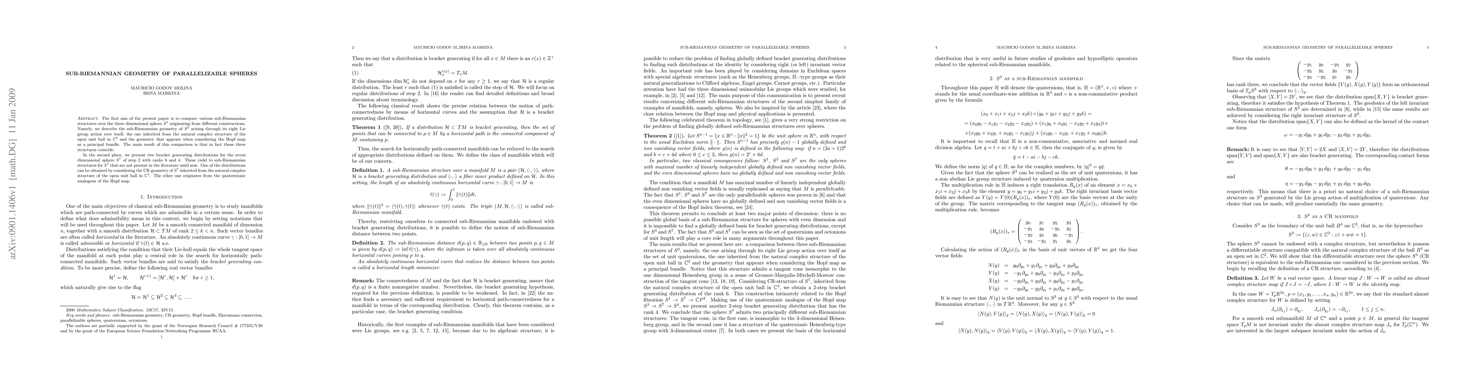 The first aim of the present paper is to compare various sub-Riemannian structures over the three dimensional sphere $S^3$ originating from different constructions. Namely, we describe the sub-Riemannian geometry of $S^3$ arising through its right Lie group action over itself, the one inherited from the natural complex structure of the open unit ball in $\comp^2$ and the geometry that appears when considering the Hopf map as a principal bundle. The main result of this comparison is that in fact those three structures coincide. In the second place, we present two bracket generating distributions for the seven dimensional sphere $S^7$ of step 2 with ranks 6 and 4. These yield to sub-Riemannian structures for $S^7$ that are not present in the literature until now. One of the distributions can be obtained by considering the CR geometry of $S^7$ inherited from the natural complex structure of the open unit ball in $\comp^4$. The other one originates from the quaternionic analogous of the Hopf map.