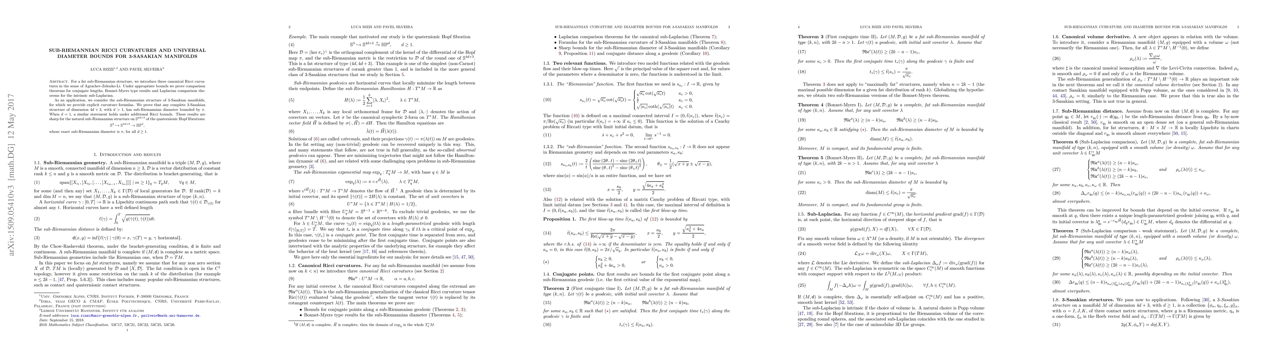 This paper introduces three canonical Ricci curvatures for fat sub-Riemannian structures and establishes comparison theorems and Bonnet-Myers type results. It applies these to 3-Sasakian manifolds, proving that their sub-Riemannian diameter is bounded by $\pi$ for $d>1$ and under additional Ricci bounds when $d=1$.