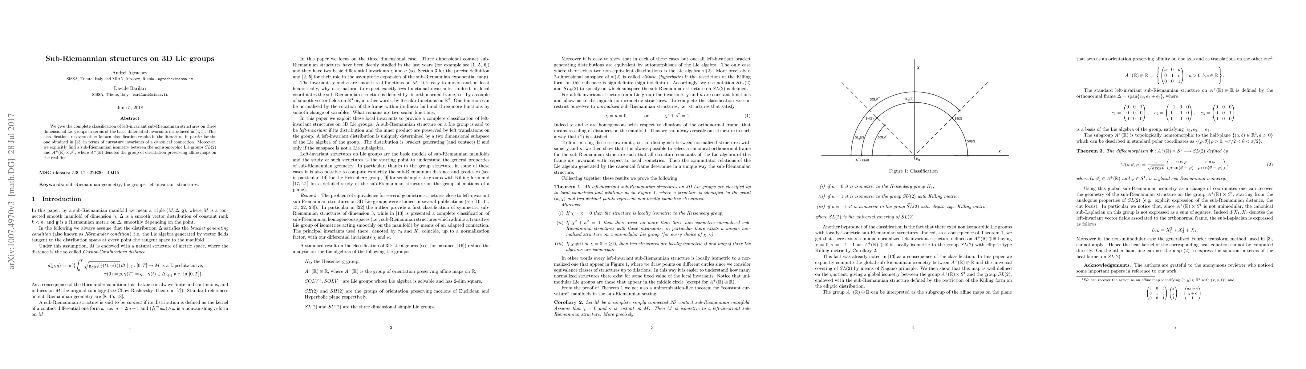 This paper classifies left-invariant sub-Riemannian structures on three-dimensional Lie groups using differential invariants, confirming prior results and establishing a sub-Riemannian isometry between $SL(2)$ and $A^{+}(\mathbb{R})\times S^1$.
