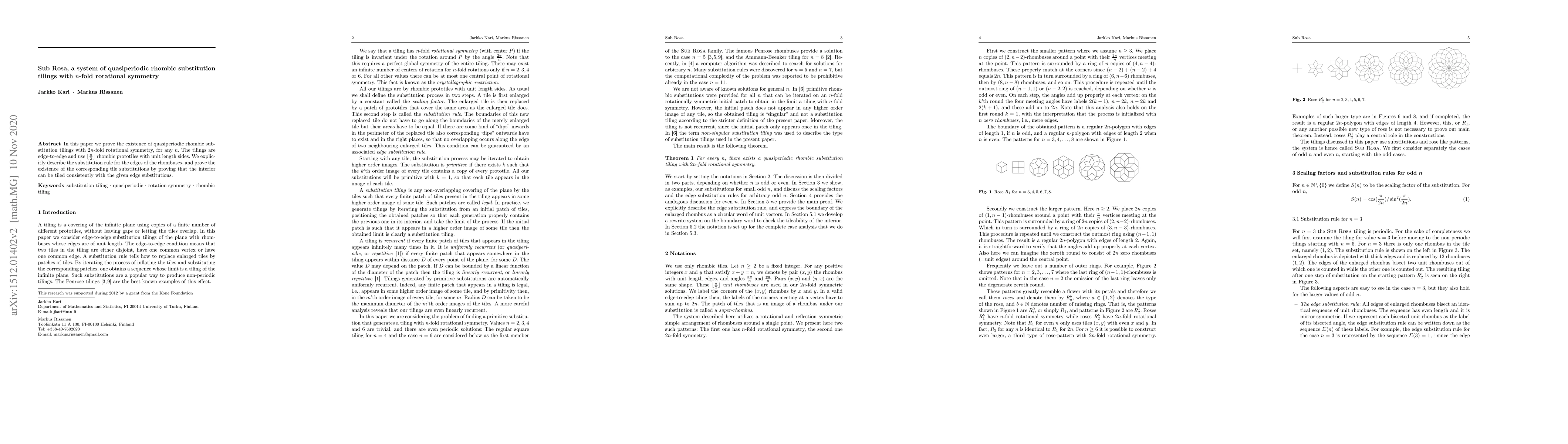 This paper establishes the existence of quasiperiodic rhombic tilings with 2n-fold rotational symmetry for any integer n, utilizing [n/2] rhombic prototiles of unit length sides, and describes the specific substitution rule for their edges.