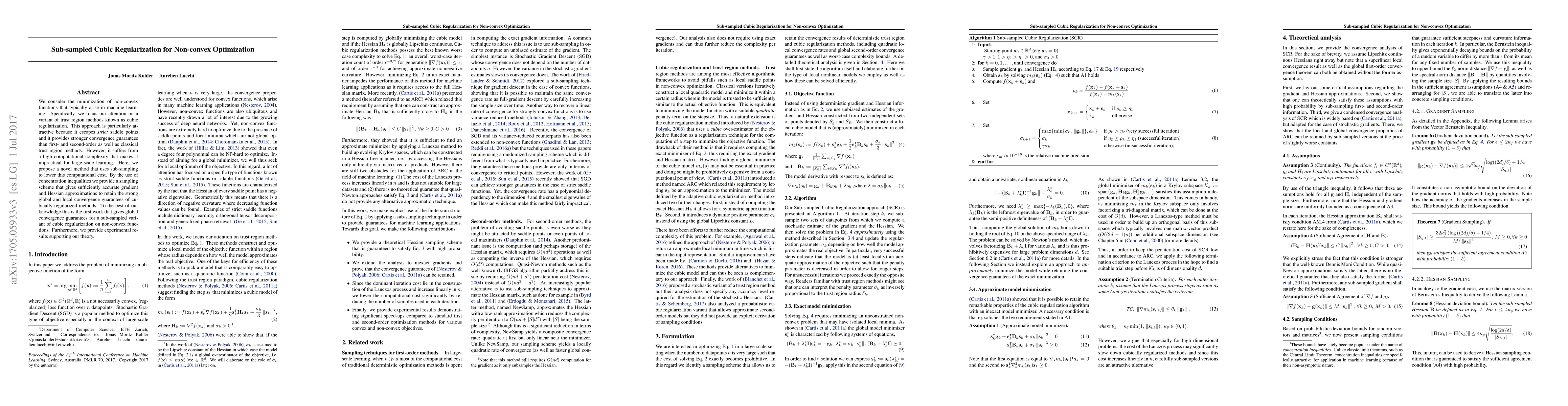 We consider the minimization of non-convex functions that typically arise in machine learning. Specifically, we focus our attention on a variant of trust region methods known as cubic regularization. This approach is particularly attractive because it escapes strict saddle points and it provides stronger convergence guarantees than first- and second-order as well as classical trust region methods. However, it suffers from a high computational complexity that makes it impractical for large-scale learning. Here, we propose a novel method that uses sub-sampling to lower this computational cost. By the use of concentration inequalities we provide a sampling scheme that gives sufficiently accurate gradient and Hessian approximations to retain the strong global and local convergence guarantees of cubically regularized methods. To the best of our knowledge this is the first work that gives global convergence guarantees for a sub-sampled variant of cubic regularization on non-convex functions. Furthermore, we provide experimental results supporting our theory.