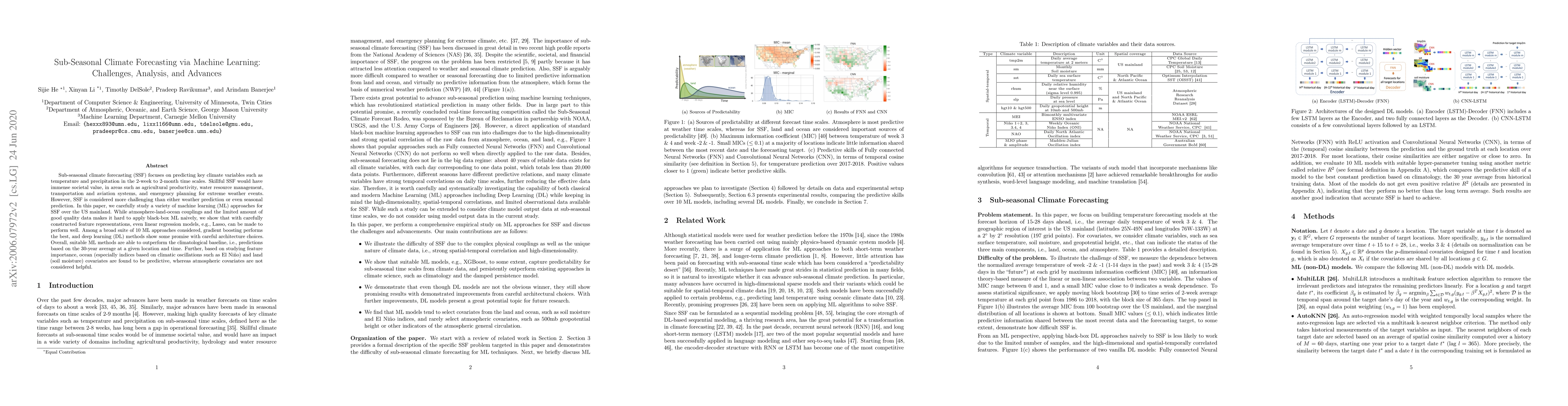 This paper explores machine learning techniques for sub-seasonal climate forecasting, finding that gradient boosting outperforms other methods, while deep learning shows promise with proper architecture. Ocean and land covariates, especially El Nino indices and soil moisture, are key predictors, whereas atmospheric variables are less useful.