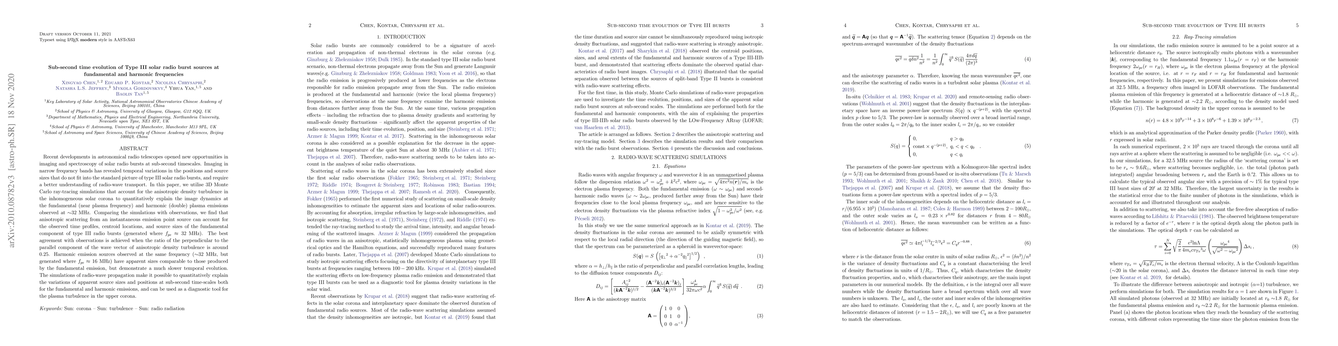 Recent developments in astronomical radio telescopes opened new opportunities in imaging and spectroscopy of solar radio bursts at sub-second timescales. Imaging in narrow frequency bands has revealed temporal variations in the positions and source sizes that do not fit into the standard picture of type III solar radio bursts, and require a better understanding of radio-wave transport. In this paper, we utilise 3D Monte Carlo ray-tracing simulations that account for the anisotropic density turbulence in the inhomogeneous solar corona to quantitatively explain the image dynamics at the fundamental (near plasma frequency) and harmonic (double) plasma emissions observed at \sim 32~MHz. Comparing the simulations with observations, we find that anisotropic scattering from an instantaneous emission point source can account for the observed time profiles, centroid locations, and source sizes of the fundamental component of type III radio bursts (generated where f_{pe} \approx 32~MHz). The best agreement with observations is achieved when the ratio of the perpendicular to the parallel component of the wave vector of anisotropic density turbulence is around 0.25. Harmonic emission sources observed at the same frequency (\sim 32~MHz, but generated where f_{pe} \approx 16~MHz) have apparent sizes comparable to those produced by the fundamental emission, but demonstrate a much slower temporal evolution. The simulations of radio-wave propagation make it possible to quantitatively explain the variations of apparent source sizes and positions at sub-second time-scales both for the fundamental and harmonic emissions, and can be used as a diagnostic tool for the plasma turbulence in the upper corona.