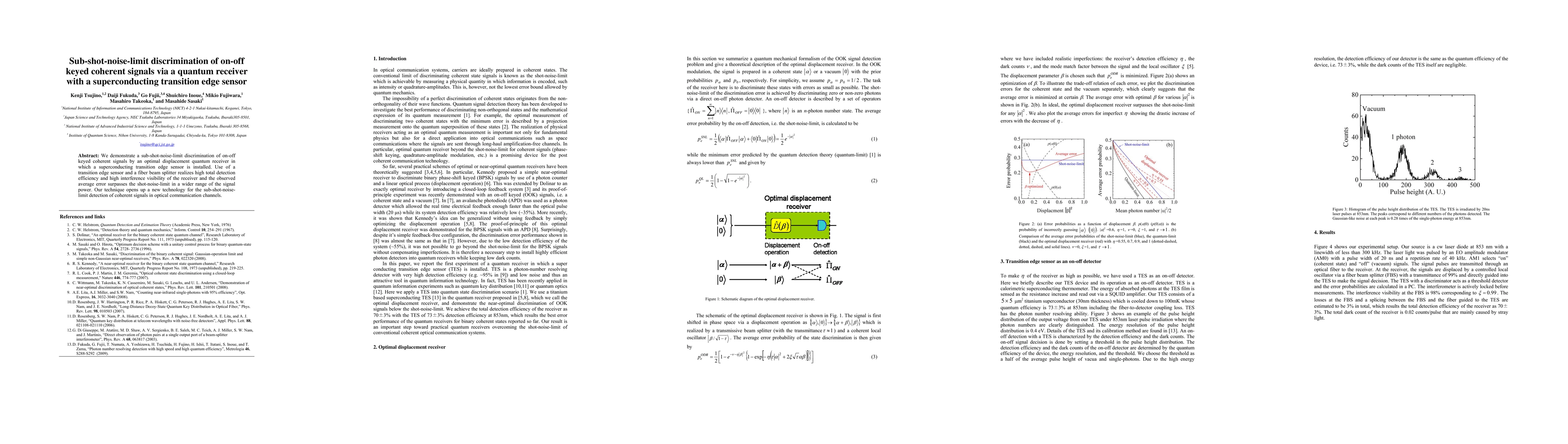 This paper demonstrates a quantum receiver using a superconducting transition edge sensor that achieves sub-shot-noise-limit discrimination for on-off keyed coherent signals, surpassing the shot-noise limit over a wider range of signal power, thus advancing technology for optical communication.