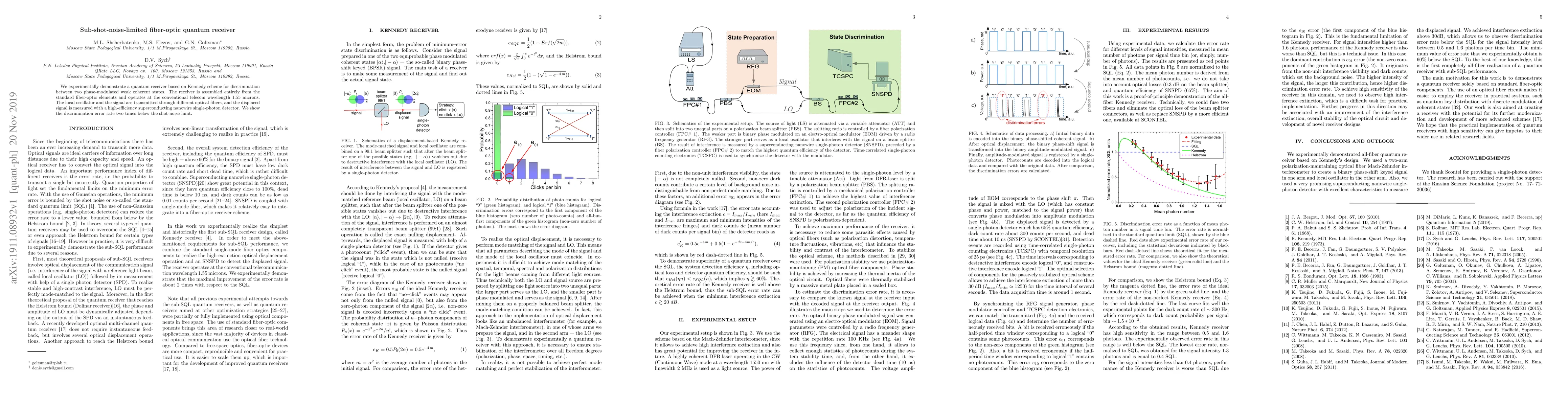 This paper demonstrates a sub-shot-noise-limited fiber-optic quantum receiver using the Kennedy scheme, achieving twice the discrimination error rate below the shot-noise limit with high-efficiency superconducting nanowire detectors. The setup operates at 1.55 microns using standard fiber-optic components.